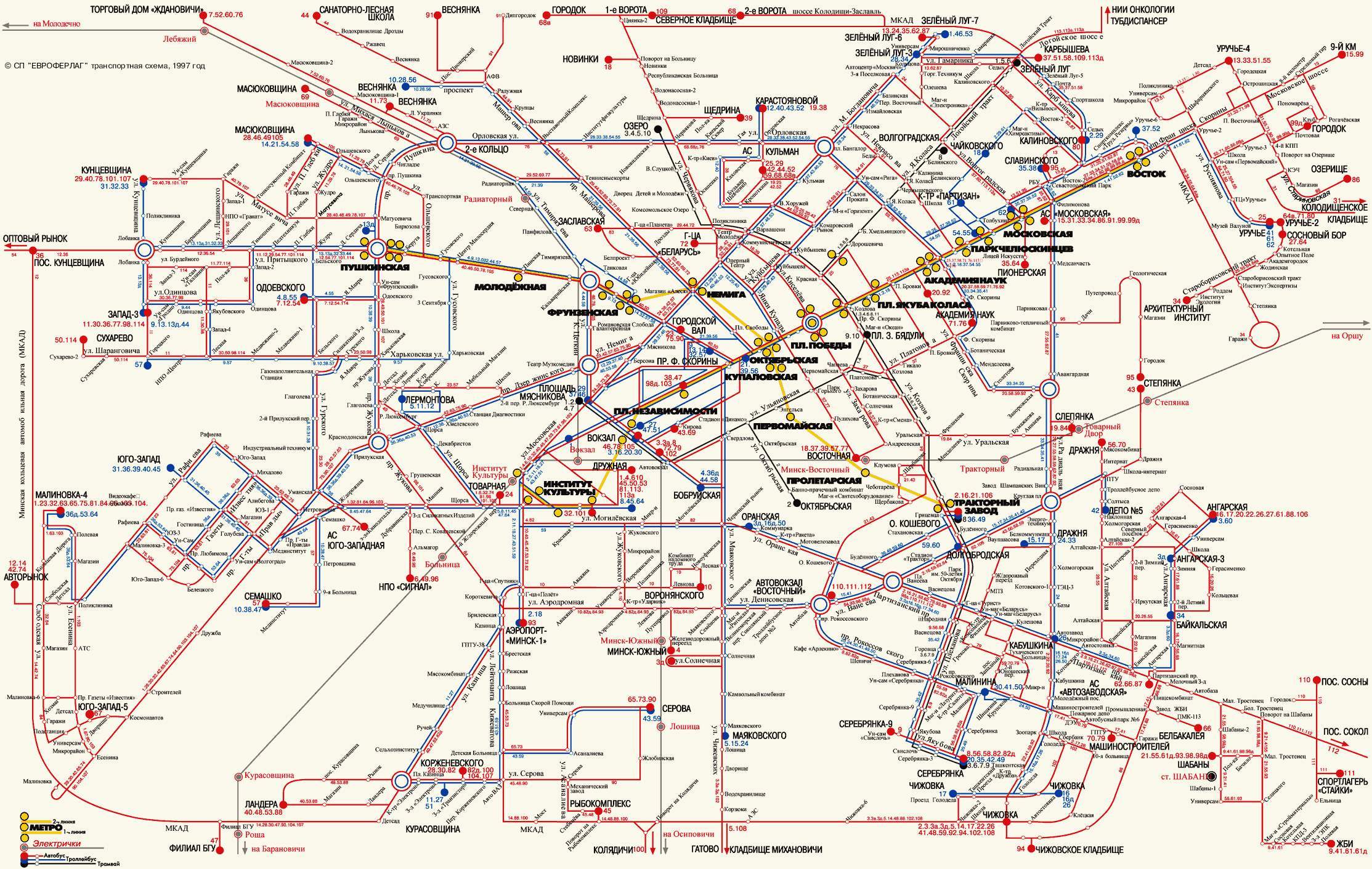 Карта городского транспорта Минска - карта, на которой графически отображены все ветки и станции городского транспорта, указаны узловые станции для пересадок на другие ветки.