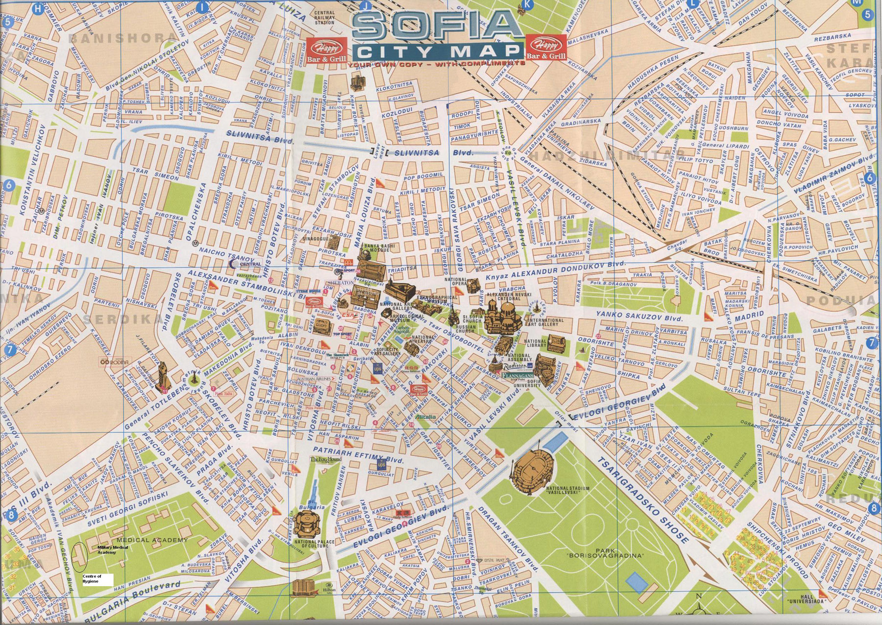 Карта центра Софии - карта, на которой подробно представлена центральная часть города: памятники архитектуры, места отдыха, музеи, театры, кафе и рестораны.