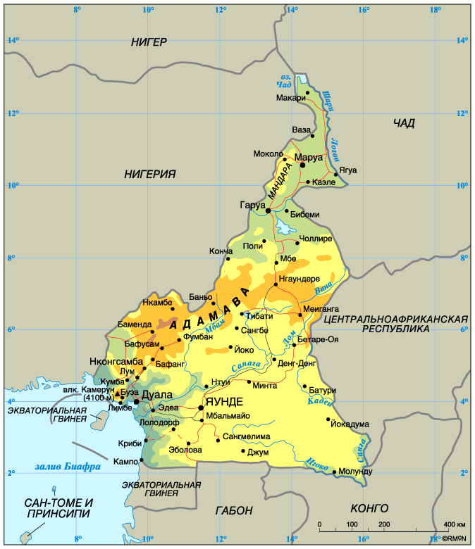 Физическая карта Камеруна - карта, на которой отображаются особенности рельефа местности, растительность, природные объекты, регионы и города, транспортные пути.