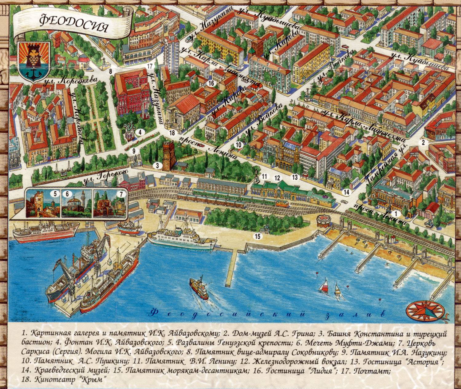 Туристическая карта Феодосии - карта, на которой представлены памятники архитектуры страны, места отдыха, музеи, театры, кафе и рестораны.