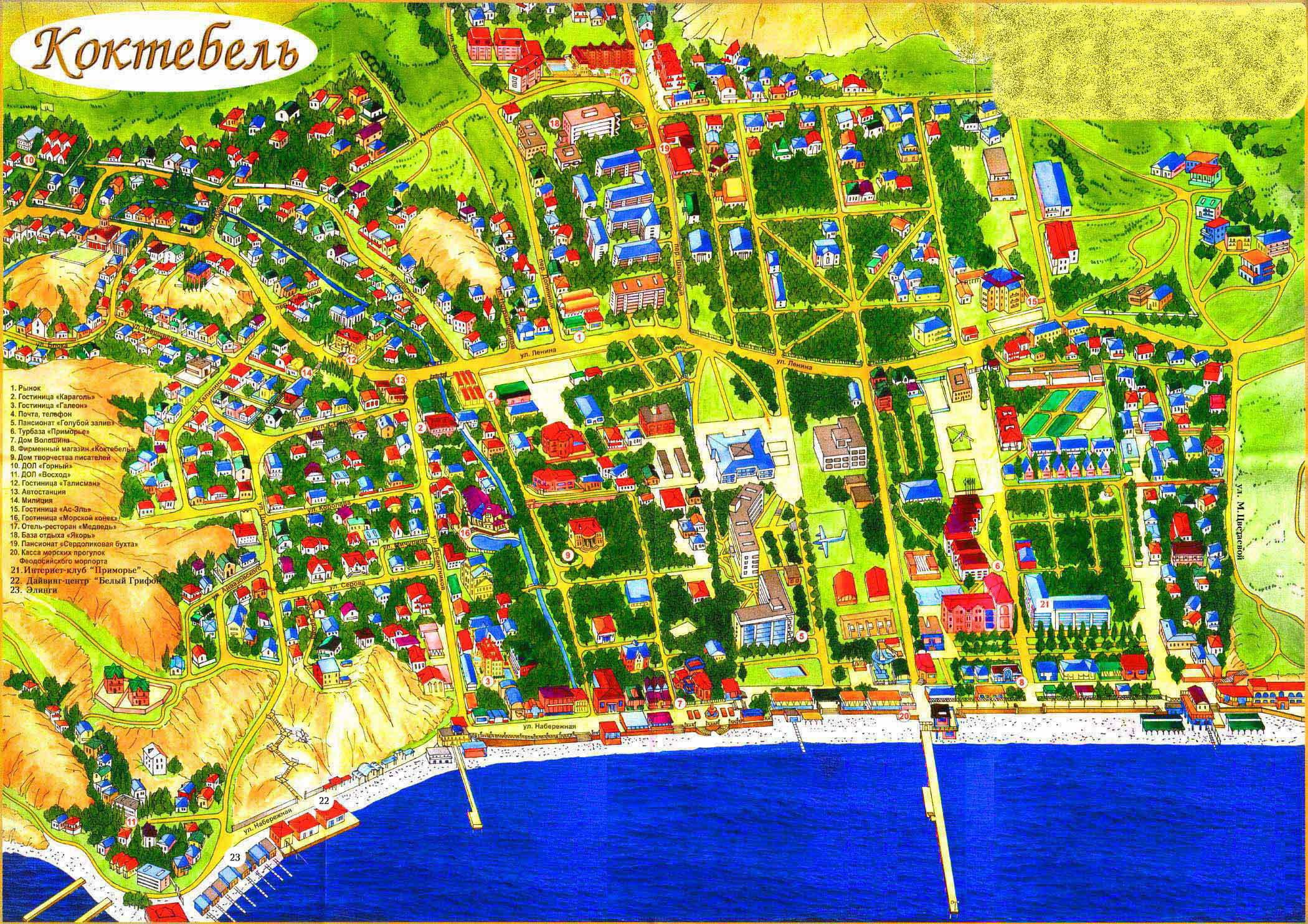 Туристическая карта Коктебеля - карта, на которой представлены памятники архитектуры страны, места отдыха, музеи, театры, кафе и рестораны.