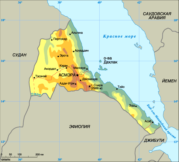 Физическая карта Эритреи - карта, на которой отображаются особенности рельефа местности, растительность, природные объекты, регионы и города, транспортные пути.