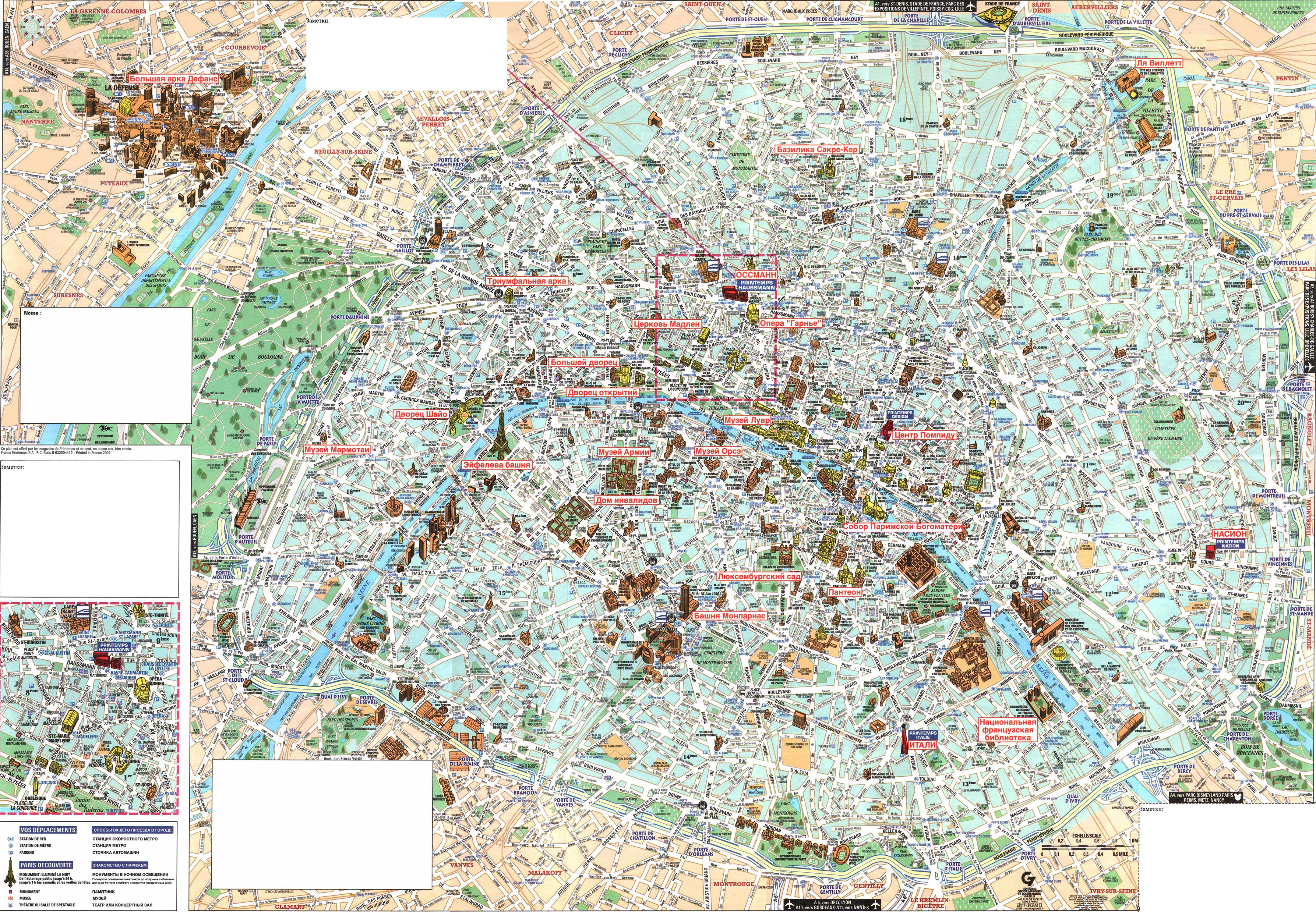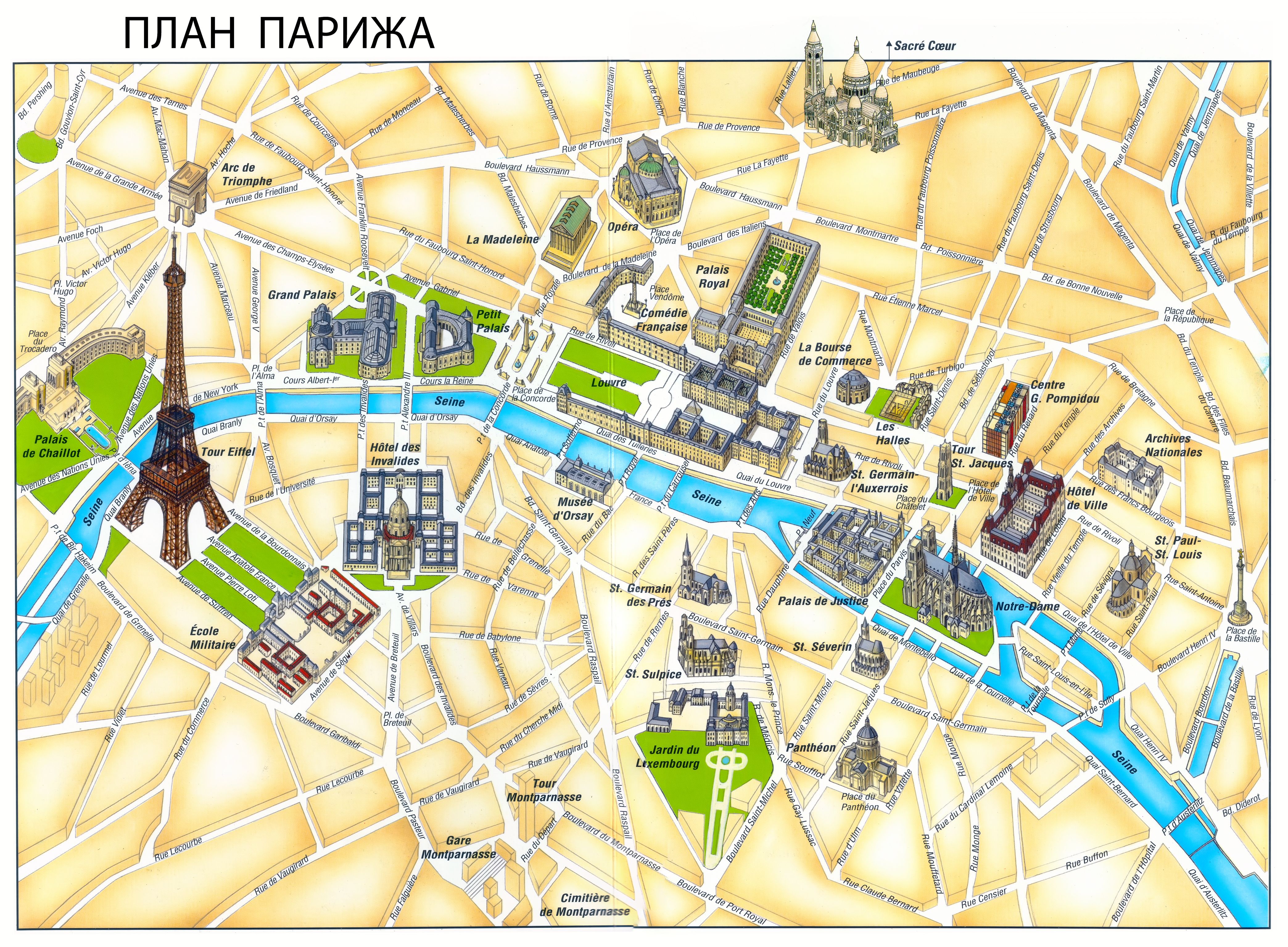Карта Парижа c достопримечательностями - карта, на которой представлены памятники архитектуры страны, места отдыха, музеи, театры, кафе и рестораны