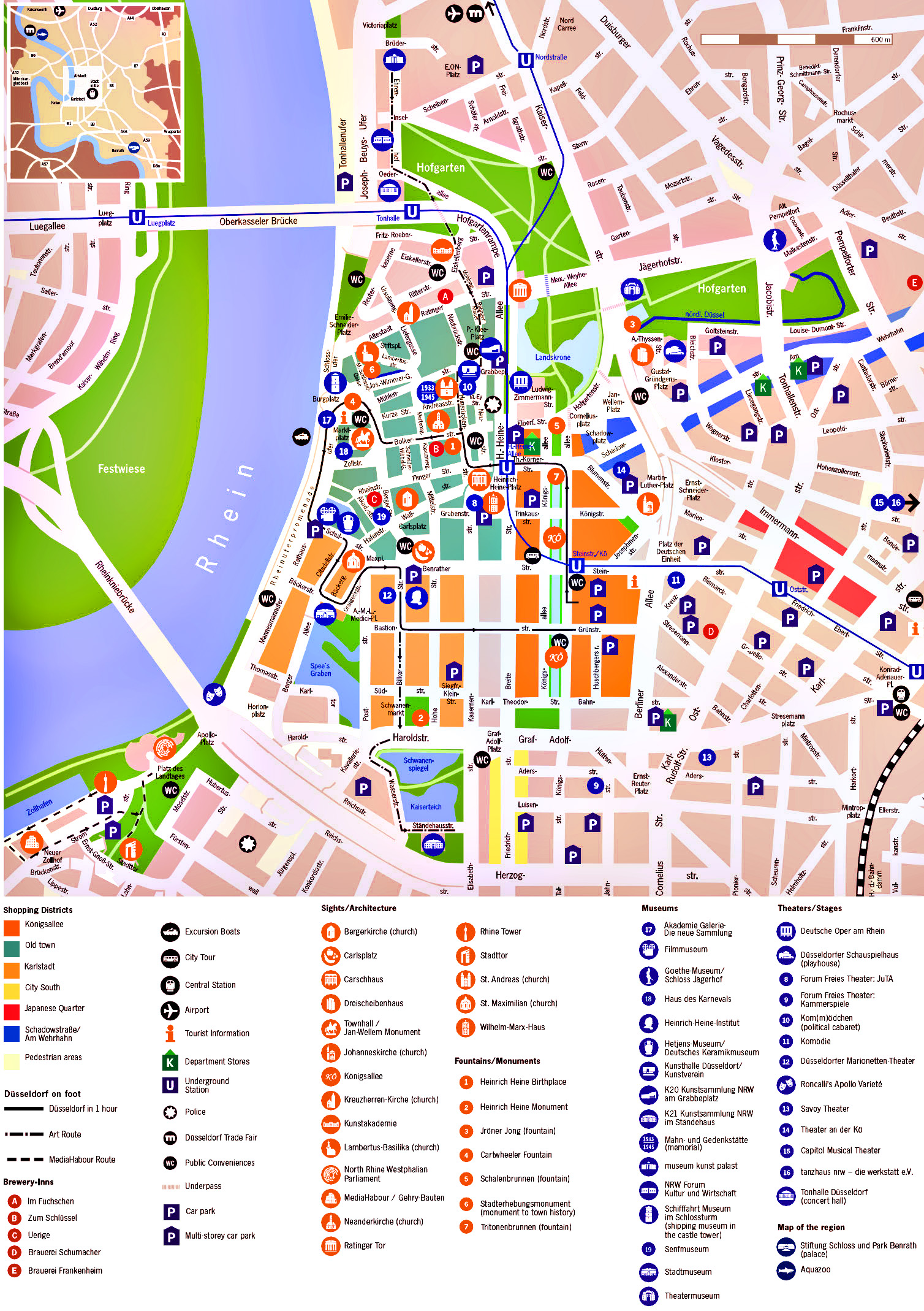 Карта центра Дюссельдорфа - карта, на которой подробно представлена центральная часть города: памятники архитектуры, места отдыха, музеи, театры, кафе и рестораны.
