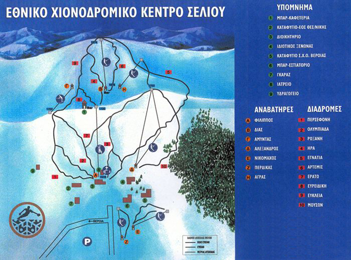 Карта горнолыжных трасс — карта, на которой изображены горнолыжные трассы курорта с указанием протяженности и перепадов высот, информация о подъемниках, обозначены отели, кафе, места проката и развлечений.