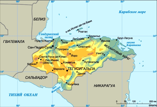 Физическая карта Гондураса - карта, на которой отображаются особенности рельефа местности, растительность, природные объекты, регионы и города, транспортные пути.