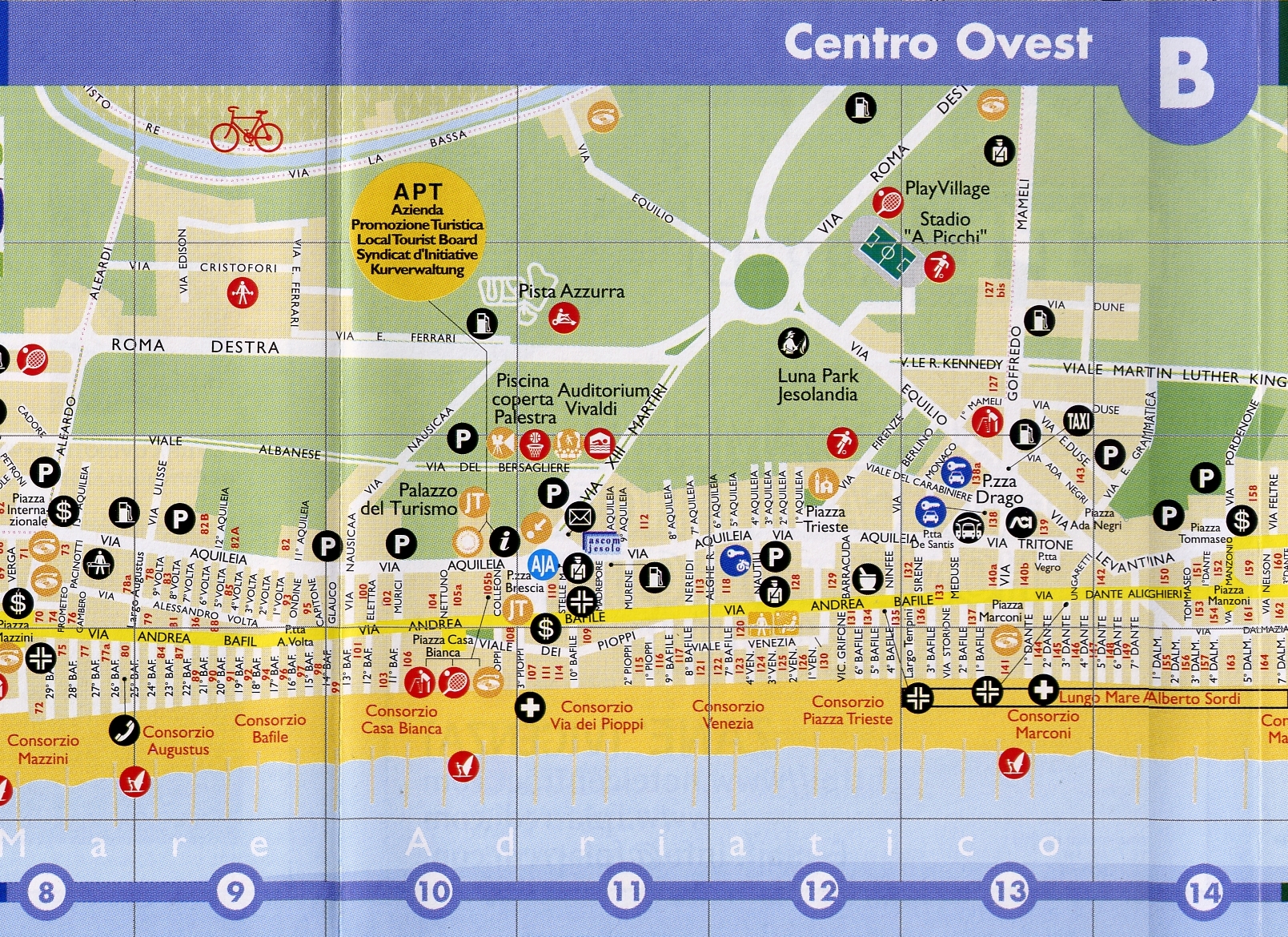 Туристическая карта Лидо ди Езоло - карта, на которой представлены памятники архитектуры страны, места отдыха, музеи, театры, кафе и рестораны.