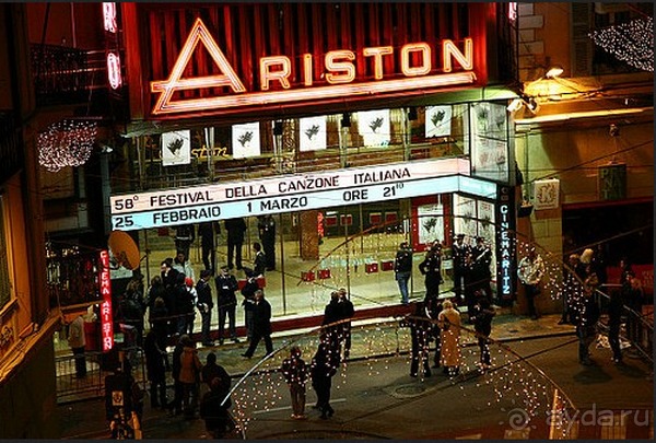 Здание театра "Аристон" возведено в 1963 году. Первоначально оно использовалось исключительно для показа кинофильмов, но с 1977 года здесь стали проводить всемирно известный песенный фестиваль Сан-Рем...