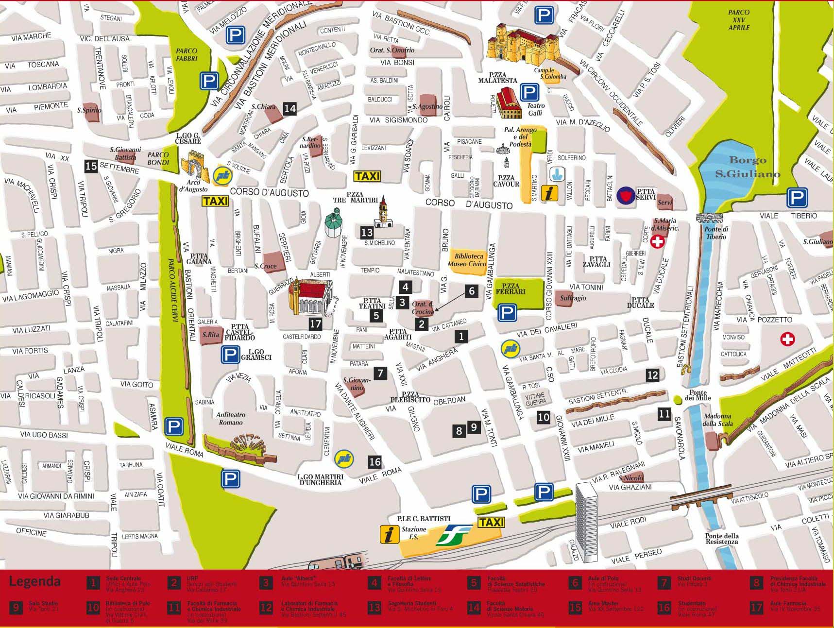 Карта центра Римини - карта, на которой подробно представлена центральная часть города: памятники архитектуры, места отдыха, музеи, театры, кафе и рестораны.