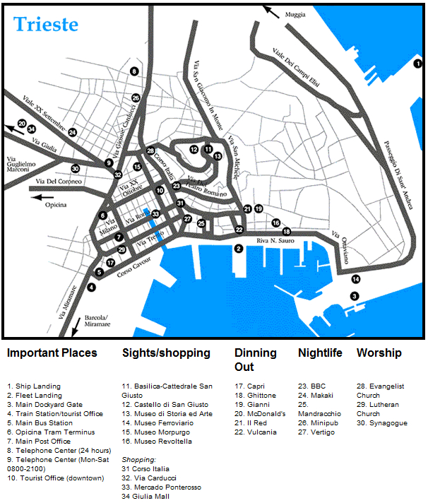 Туристическая карта Триеста - карта, на которой представлены памятники архитектуры страны, места отдыха, музеи, театры, кафе и рестораны.