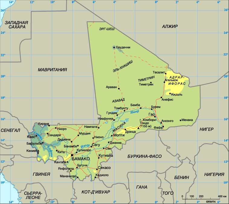 Физическая карта Мали - карта, на которой отображаются особенности рельефа местности, растительность, природные объекты, регионы и города, транспортные пути.