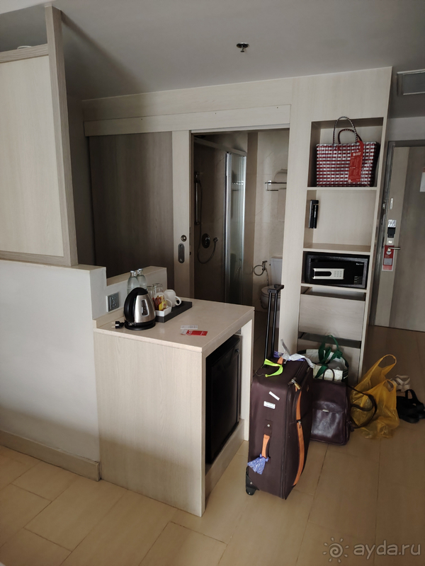 У нас был номер на 5 этаже с видом на другой отель, улицу и огромную пальму. Коридоры чистенькие, как и номер. Всё необходимое для жизни имелось: большая кровать, два кресла, диванчик, письменный и журнальный столик, две прикроватные тумбочки, лампы, телевизор (много каналов, нашли один русский + есть разъём для флэшки), полки для вещей, сейф, столик для еды, чайник, посуда, холодильник, большое и маленькое зеркало, раковина, фен, утюг, гладильная доска, большая душевая кабина, тумбочка в коридоре, вешалки. При заселении нас встретил слоник из полотенец, очень мило. Очень понравилось панно на стене.