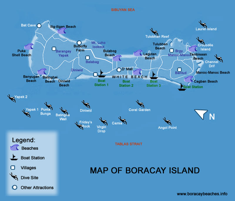 Туристическая карта Боракай - карта, на которой представлены памятники архитектуры страны, места отдыха, музеи, театры, кафе и рестораны.