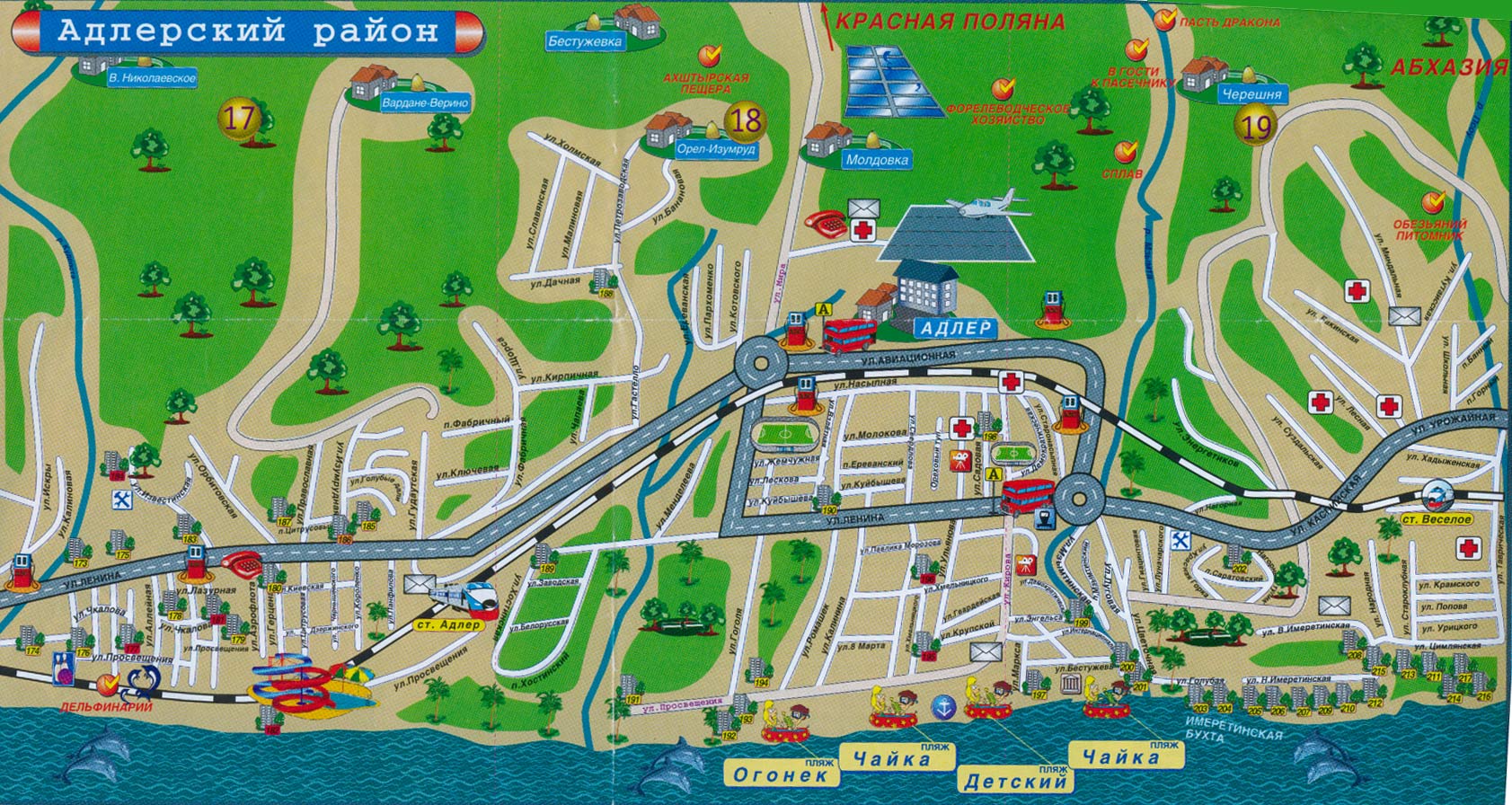 Туристическая карта Адлера - карта, на которой представлены памятники архитектуры страны, места отдыха, музеи, театры, кафе и рестораны.