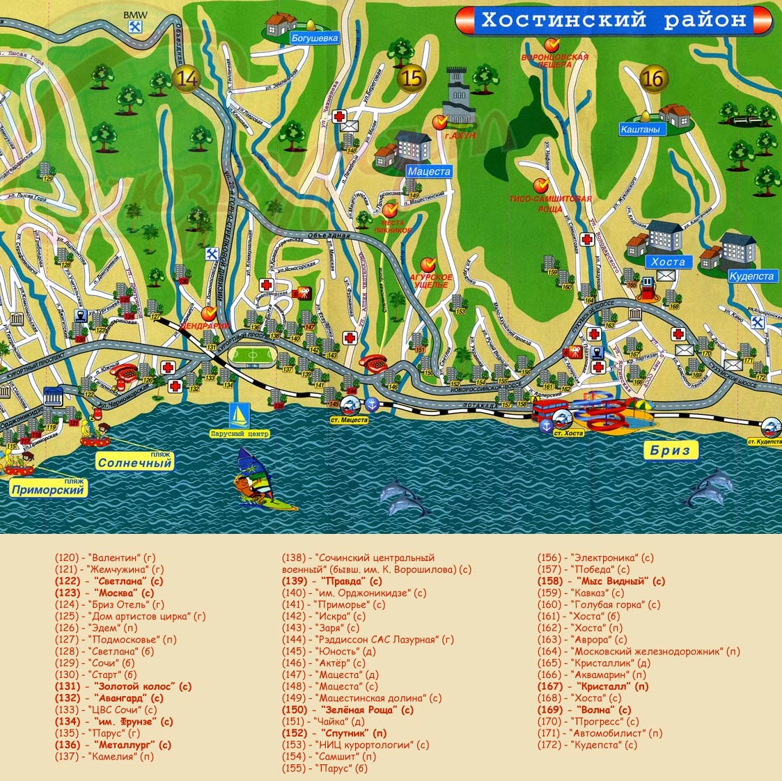 Туристическая карта Хосты - карта, на которой представлены памятники архитектуры страны, места отдыха, музеи, театры, кафе и рестораны.