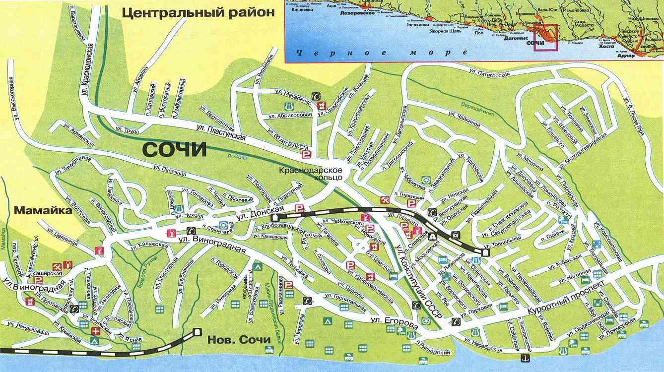 Туристическая карта Сочи Центр - карта, на которой представлены памятники архитектуры страны, места отдыха, музеи, театры, кафе и рестораны.