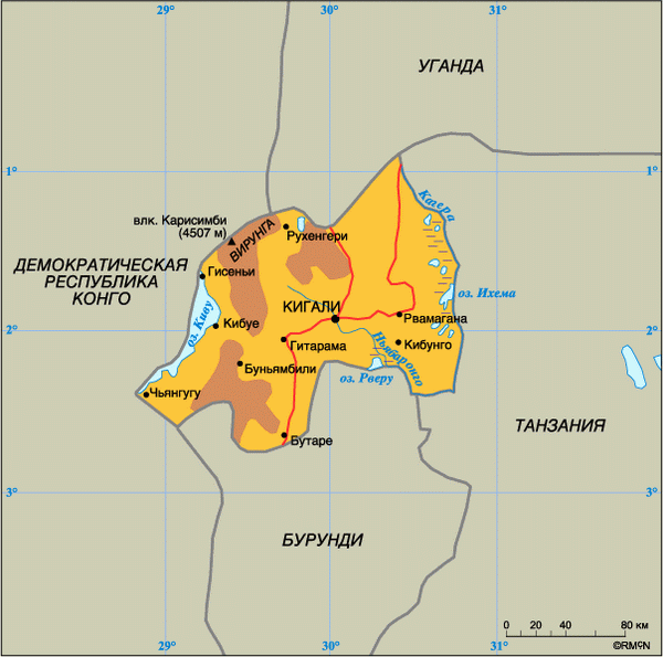Физическая карта Руанды - карта, на которой отображаются особенности рельефа местности, растительность, природные объекты, регионы и города, транспортные пути.