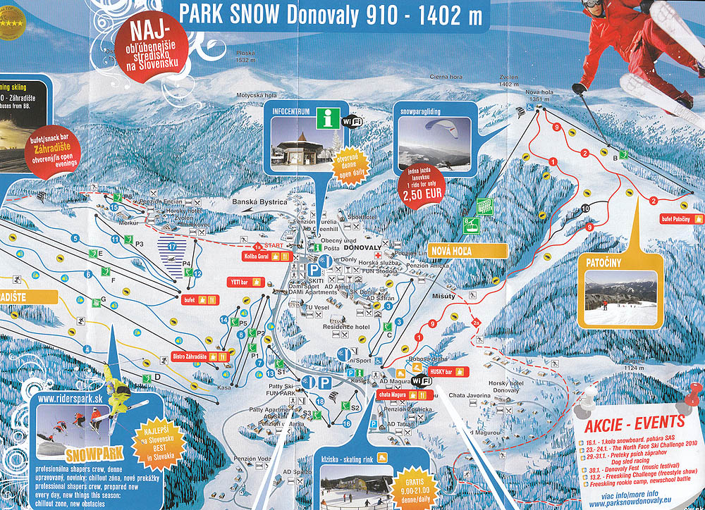 Карта горнолыжных трасс — карта, на которой изображены горнолыжные трассы курорта с указанием протяженности и перепадов высот, информация о подъемниках, обозначены отели, кафе, места проката и развлечений.