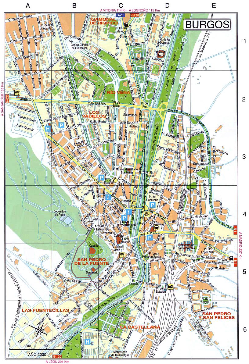 Туристическая карта Бургоса - карта, на которой представлены памятники архитектуры страны, места отдыха, музеи, театры, кафе и рестораны.