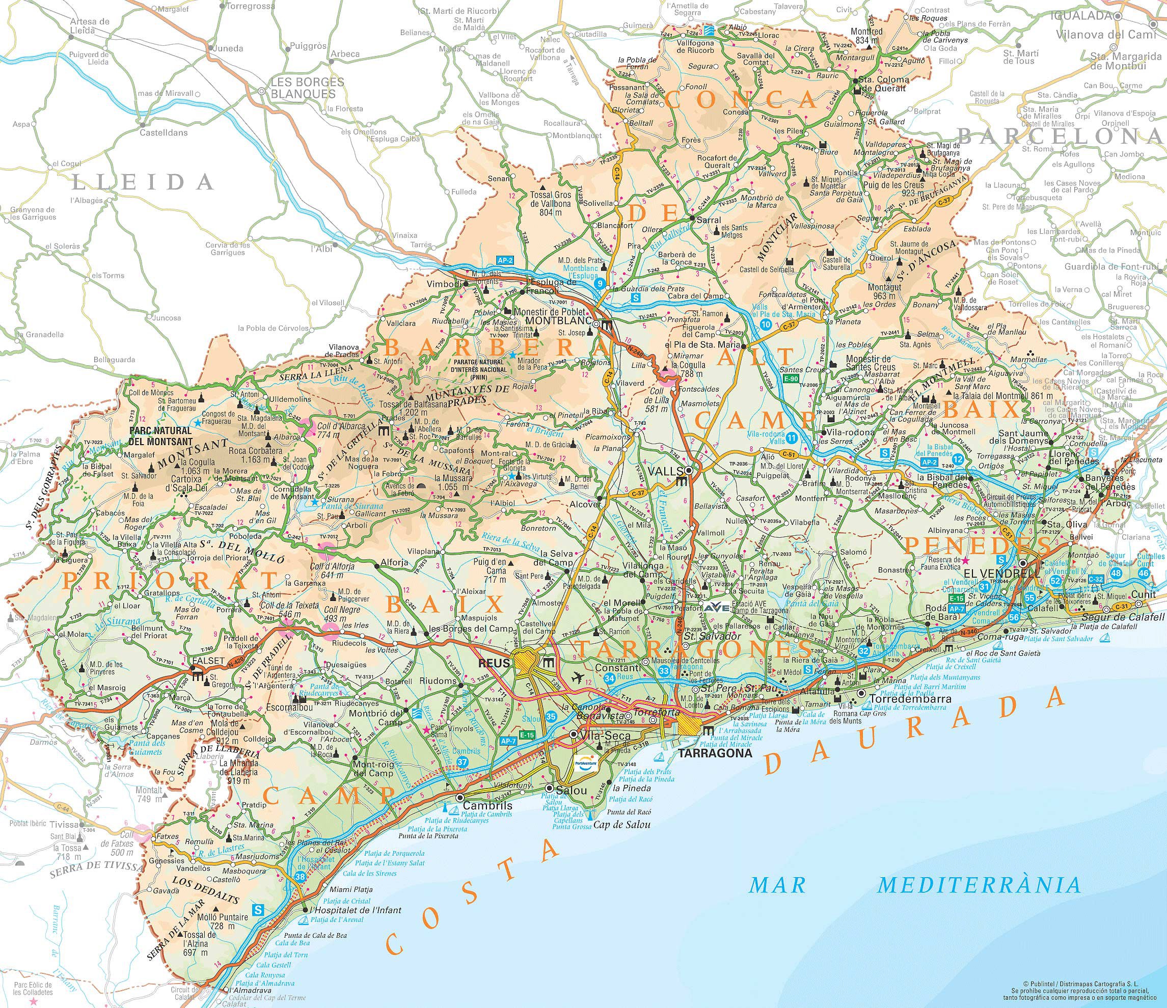 Туристическая карта Коста Дорада - карта, на которой представлены памятники архитектуры страны, места отдыха, музеи, театры, кафе и рестораны.