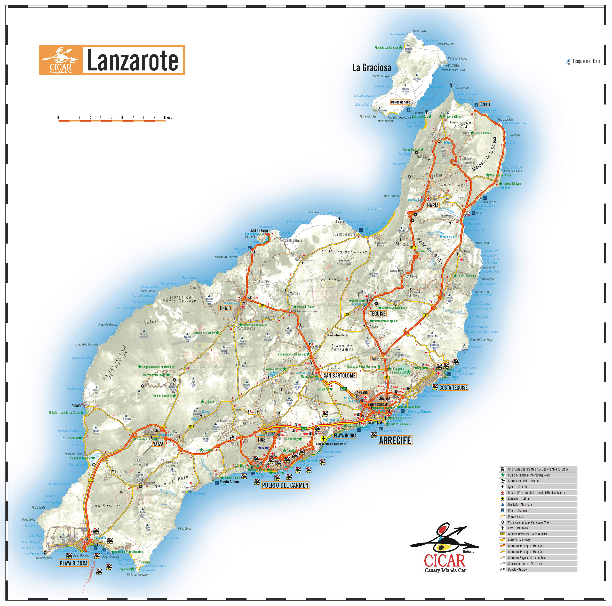 Туристическая карта Лансароте - карта, на которой представлены памятники архитектуры страны, места отдыха, музеи, театры, кафе и рестораны.