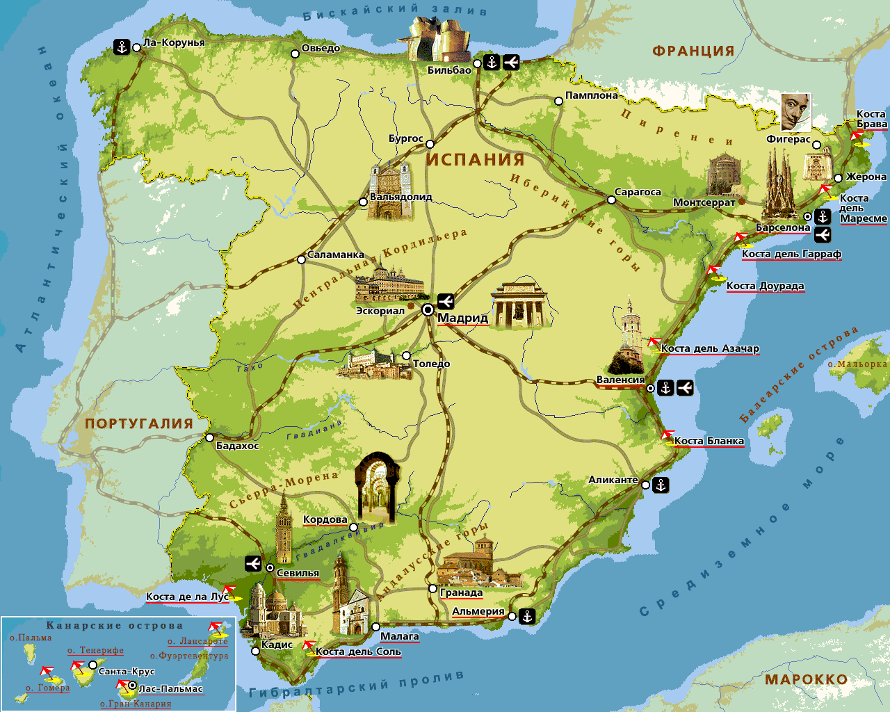 Карта Испании с городами и курортами