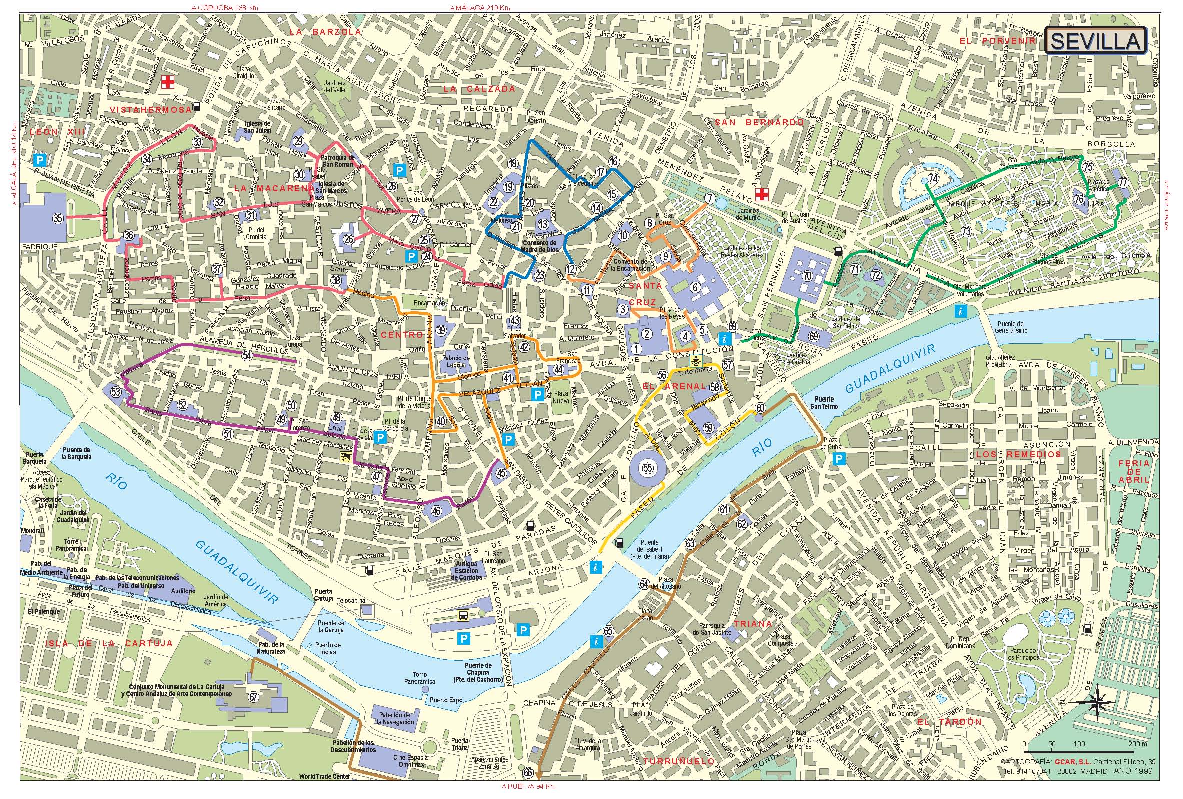Подробная карта Севильи - карта, на которой подробно изображена местность. Подробная карта содержит сведения о рельефе, городах, населенных пунктах, дорогах, коммуникациях и других объектах местности.