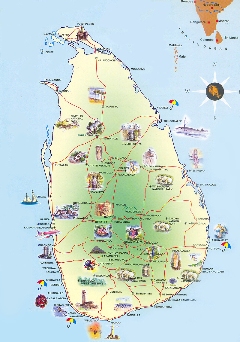 Туристическая карта Шри-Ланки - карта, на которой представлены памятники архитектуры страны, места отдыха, музеи, театры, кафе и рестораны.