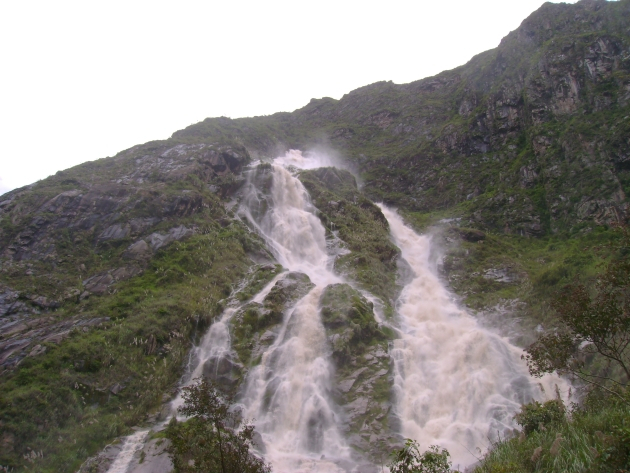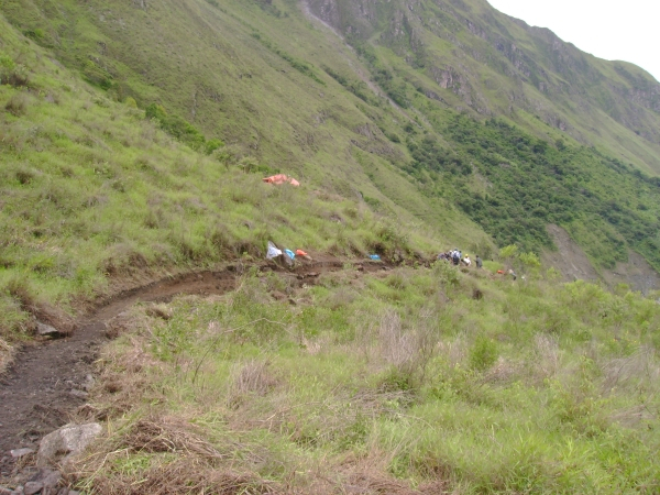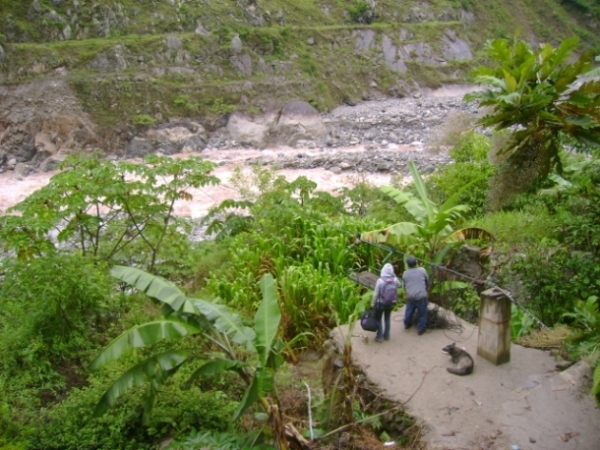 А в остальном всё та же скользкая тропинка, описывающая синусоиду от самой кромки воды до высоты метров в 150 над рекой. Короче, не Бродвей ни фига. Пока шёл, всё на свете проклял. С тоской вспоминал экскурсию к озеру Ланотуу на Самоа, куда тоже в дождь ходил. Я-то думал, там дорога хреновая... По крайней мере, падать там было особо некуда… Зато здесь собак не было, которые меня там чуть не сожрали. И колючек нет. Приободрившись этой мыслью, топаю дальше. Навстречу плетутся три комка грязи, в одном из которых узнаю вчерашнего финна. С ним ещё два белых. Чё такое? – спрашиваю. Задыхающимися голосами объясняют, что дорога – полная , и вообще, ну его нахрен, это Мачу-Пикчу, с них экстрима хватит. А остальные где? Дальше пошли… Ну, ладно. Продолжаю движение. Через три часа после переправы склон горы отступает от реки, тропинка спускается и идёт дальше по равнине. От этого места в сторону переправы группа перуанцев с ломами и лопатами пробивает новую дорогу взамен уползшей в реку.