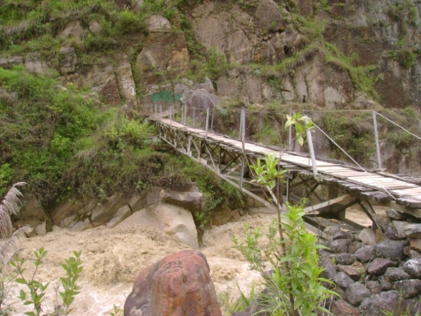 Это исчадие индейской изобретательности сразу внушило мне дурные предчувствия. Две каменных площадки на противоположных (и чертовски далёких друг от друга) берегах Урубамбы, между ними натянут металлический трос, на котором подвешена хлипкого вида деревянная клеть на металлическом каркасе. По основному тросу через кольца пущены две верёвки, от каждой опорной площадки к ближайшей стороне клети. Т.е. садишься, свешиваешь вниз конечности, и тянешь за верёвку с той стороны, куда тебе надо. Верёвки, разумеется, сзади запутываются, а спереди вымазывают тебя всего в смазке и лезут в физиономию. На редкость дурацкая и неудобная система. Какая религия запрещает аборигенам присобачить на клеть две лебёдки – ХЗ. Гораздо удобнее было бы. Читал, что тросы, якобы, расположены под наклоном, и можно съехать на другой берег без усилий, под действием гравитации. Звиздёж. Во-первых, трос всего один. Во-вторых, опорные площадки расположены на одном уровне, так что трос лишь провисает в середине, в полном соответствии с законами физики. Т.е. примерно треть пути проезжаешь действительно с помощью собственных килограммов, ещё треть без особых усилий, а вот последний участок, когда нужно тянуть всю эту конструкцию вверх – вот это полная . Особенно в дождь, когда и без того промасленная верёвка скользит в руках, обдирая их до крови. Для полного комплекта учтите, что верёвка сзади обладает свойством запутываться, и тогда приходится ехать обратно и распутывать её. В общем, очень хорошо, если на обеих опорных площадках есть по паре мужиков, готовых Вас подстраховать и помочь. В противном случае переправа становится довольно экстремальной.