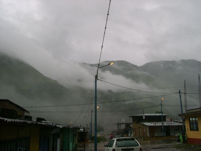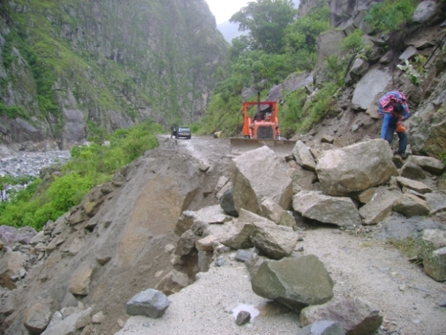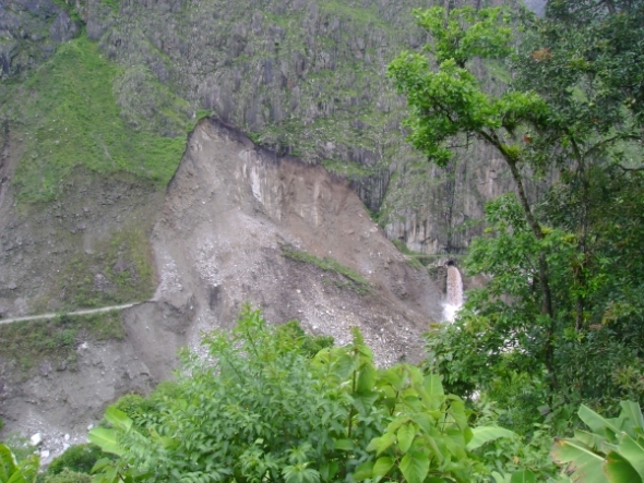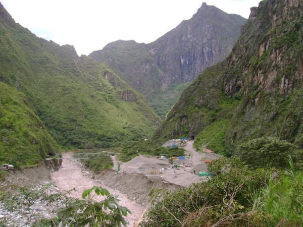 Очень красиво, фотография этого не передаёт. Одеваю сверху пластиковую накидку, и, не спеша, начинаю топать по указанной аборигенами дороге. Вернее, полосе разъезженной, липкой грязи. Шум мотора сзади, оглядываюсь – вчерашний таксист, в салоне ещё двое сидят, мужик и женщина, местные.- здорово/здорово!- Ты на Мачу-Пикчу?- Ага.- Садись, эти двое в Аква Кальентес добираются, вместе пойдёте. Я вас до канатной переправы довезу. За 5 солей.- Поехали.Едем. Дорога не очень совпадает с описанной у Адвоката73, возможно, наводнение повлияло. Один небольшой мост, второй, снова горный серпантин, затем длинный и не очень надёжно выглядящий мост над бушующей внизу Урубамбой. Минут через пять после моста впереди появляется перекрывший дорогу обвал, который медленно, но методично ликвидирует кучка аборигенов с помощью бульдозера и пары отбойных молотков.