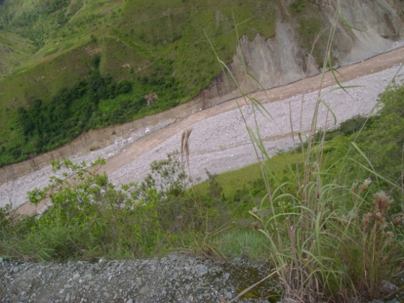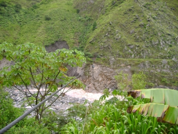 Карабкаемся в обход по скалам. Через 10 минут все мы были мокрыми до нитки, к тому же с ног до головы покрыты толстым слоем грязи. Романтика, блин… Таким макаром, через обвалы и оползни, чередующиеся с вполне приличными кусками дороги, добираемся до канатной переправы.