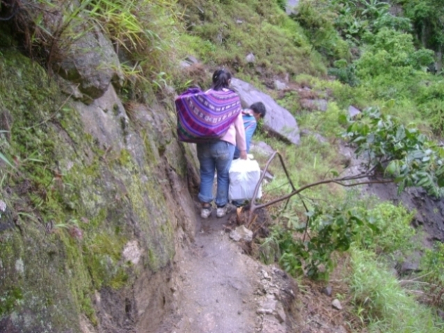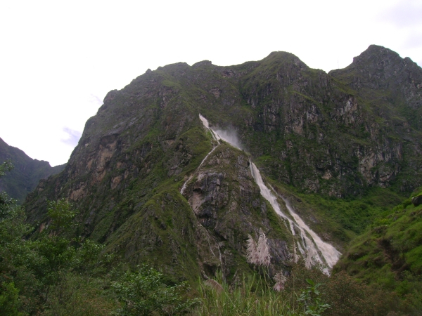 Первым отправляется мужик. На той стороне также небольшая очередь, обратно приезжает сразу два худосочных аборигена. Второй ходкой убывает женщина. Верёвка запутывается, с середины тянем её назад, распутываем, на том берегу сразу толпа народу тянут за трос, так что практически никаких усилий от неё не требуется. Обратно приезжает куча тюков, которые разбираются приехавшими предыдущей ходкой аборигенами. Сажусь сам, укладываю сзади рюкзак – поехали! Я, как уже упоминал, высоты боюсь. Не то чтоб прям вообще в ступор впадаю, но неуютно весьма себя ощущаю. Особенно, когда метрах в 15 внизу ревёт среди острых скал горная река, по которой плывут вырванные с корнем деревья. Острые, в общем, ощущения. Но доехал нормально, народ впереди помогал, тянули за верёвку.«Мои» аборигены уже ушли вперёд.Иду дальше. Около 100 метров нормального пути, под ногами угадываются остатки некогда проложенной здесь железной дороги, давно уже пришедшей в упадок, и по большей части уплывшей в Урубамбу. Увы, вскоре всё это прерывается свеженьким оползнем. По почти вертикальному склону зигзагом карабкается вверх явно недавно протоптанная тропинка. Нахожу палку подлиннее (нужная вещь в карабкании по горам, позволяет за счёт рук немного разгрузить ноги. С учётом больного колена – очень актуально для меня), и вперёд. Блин… Тропинка поднимается вверх метров на 120. Идёт дождь, кругом грязь, скользко, рюкзак за спиной равновесия не добавляет. Пару раз чуть не улетел в Урубамбу. Там кругом растёт что-то вроде пальм.
