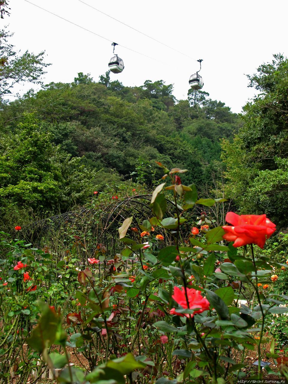 Весь промежуток между средней и верхней станциями занимает Herb Gardens (Травяной сад), который еще иногда называется Rokko Garden Terrace (Садовая терраса Рокко). Не знаю почему, но в Японии частенько можно встретить два названия одного и того же объекта. Потому стоит указать, что на официальном сайте это место все же называется Kobe Nunobiki Herb Gardens и ведет к нему Nunobiki Herb Garden Ropeway. И вот мы "пролетаем" прямо над террасами сада...