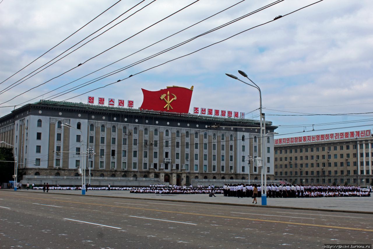 А по центру красуется здание Народного дворца учёбы (на котором располагаются правительственные трибуны). Это здание занимает Государственная Библиотека КНДР.