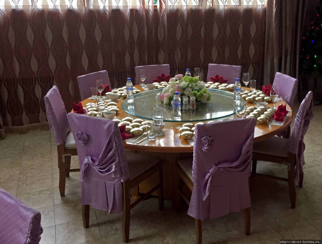 А здесь стоял круглый столик как раз сервированный на восемь персон (значит гиды не буду сидеть с нами за одним столом).