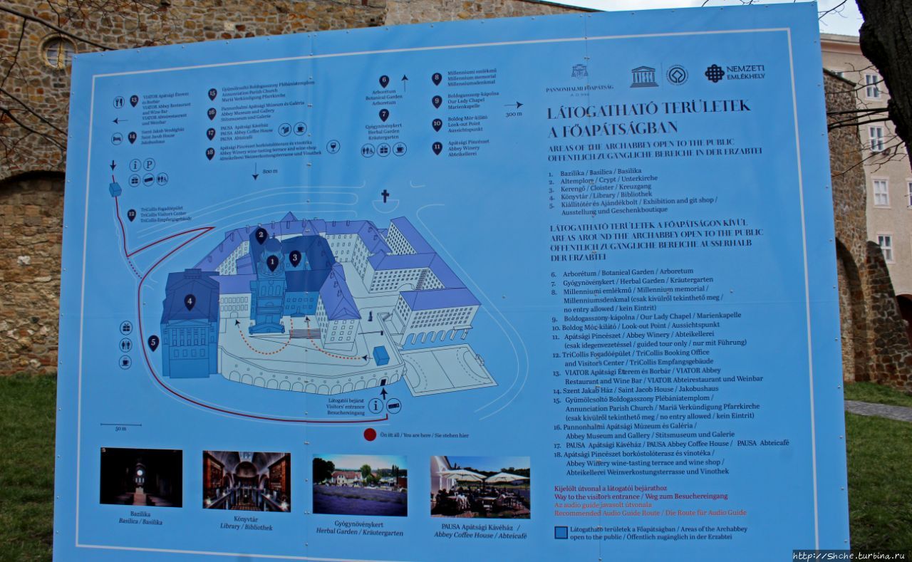 Как видно из схемы у входа, посетителям предлагается пройти в комплекс, включающий в себя Бизилику, Клостер (внутренний двор) и Крипту (цифры 1,2 и 3) а так же в замечательную монастырскую библиотеку.
