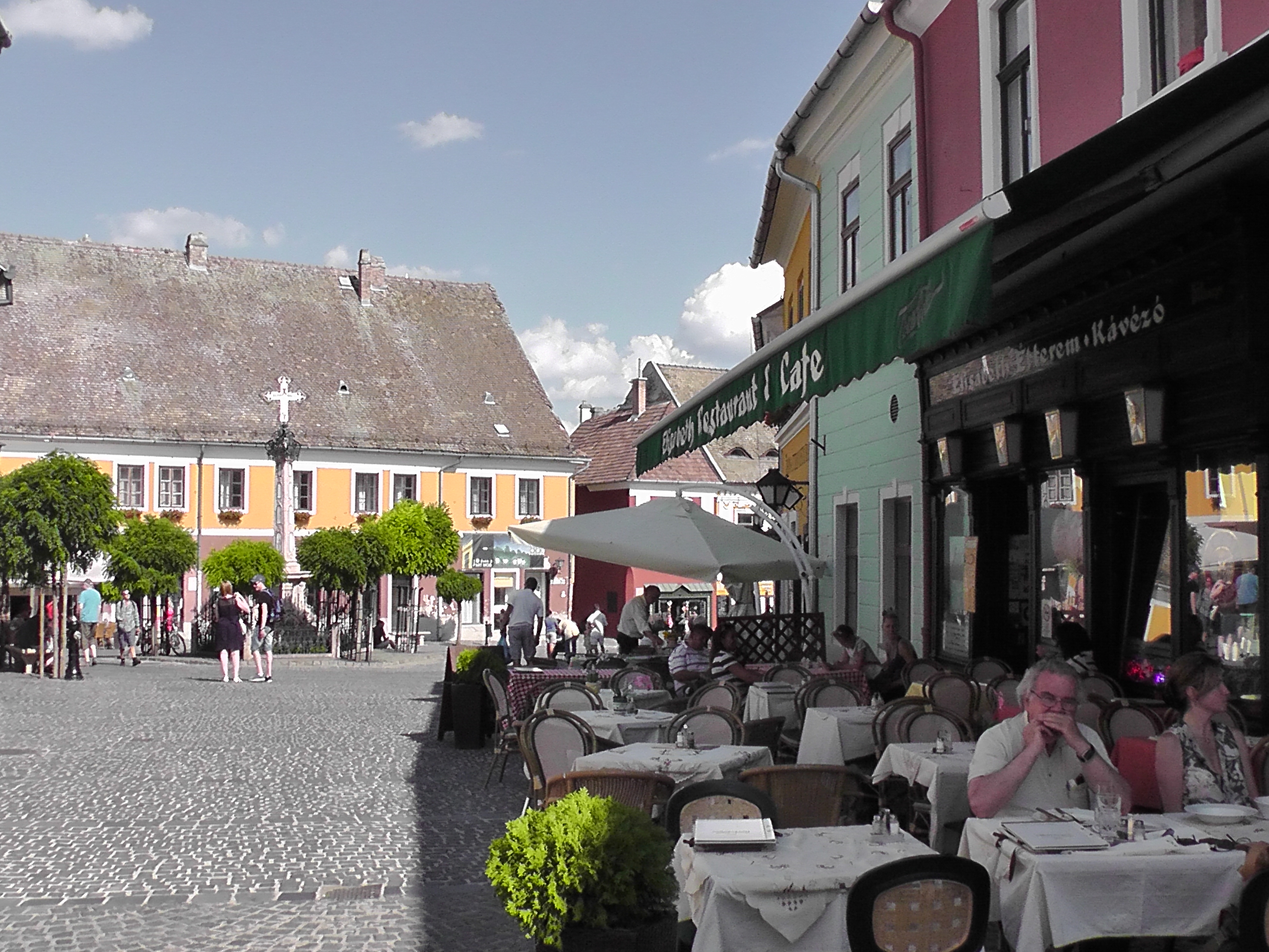 На Главной площади (Fõ tér), окруженной купеческими домами, стоит Чумной крест - Крест Св.Лазаря во избавление от Черной Смерти 1763 года. Он был поставлен на деньги сербских торговцев. Кованая ограда вокруг него – прекрасный образец венгерского кузнечного искусства в стиле рококо.