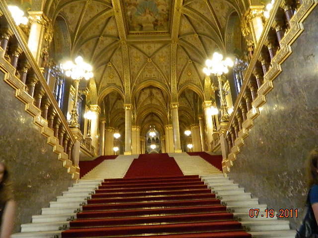 Над парламентом реют два флага. Первый - красно-бело-зеленый, флаг Венгрии. Второй, голубой - флаг Секейского края. Это непризнанная национально-территориальная автономия на территории Румынии. Секеи жили и живут в Трансильвании, которая до 1920 года входила в состав Венгрии. Шпили неоготических башен, огромный купол придают зданию вид сказочного, необыкновенного дворца и обещают еще больше царской роскоши внутри. Центральный зал парламента расположен точно по центру здания и называется «купольным». Венчает зал купол диаметром 21 метр и общей со зданием высотой 96 м. У самого купола высота 27 метров. В зале 16 колонн, поддерживающих купол. Наверху колонн находятся скульптуры правителей Венгрии разных исторических эпох. Зал был расписан фресками, украшен скульптурами, на стенах — картины венгерских художников. Все являются подлинниками.