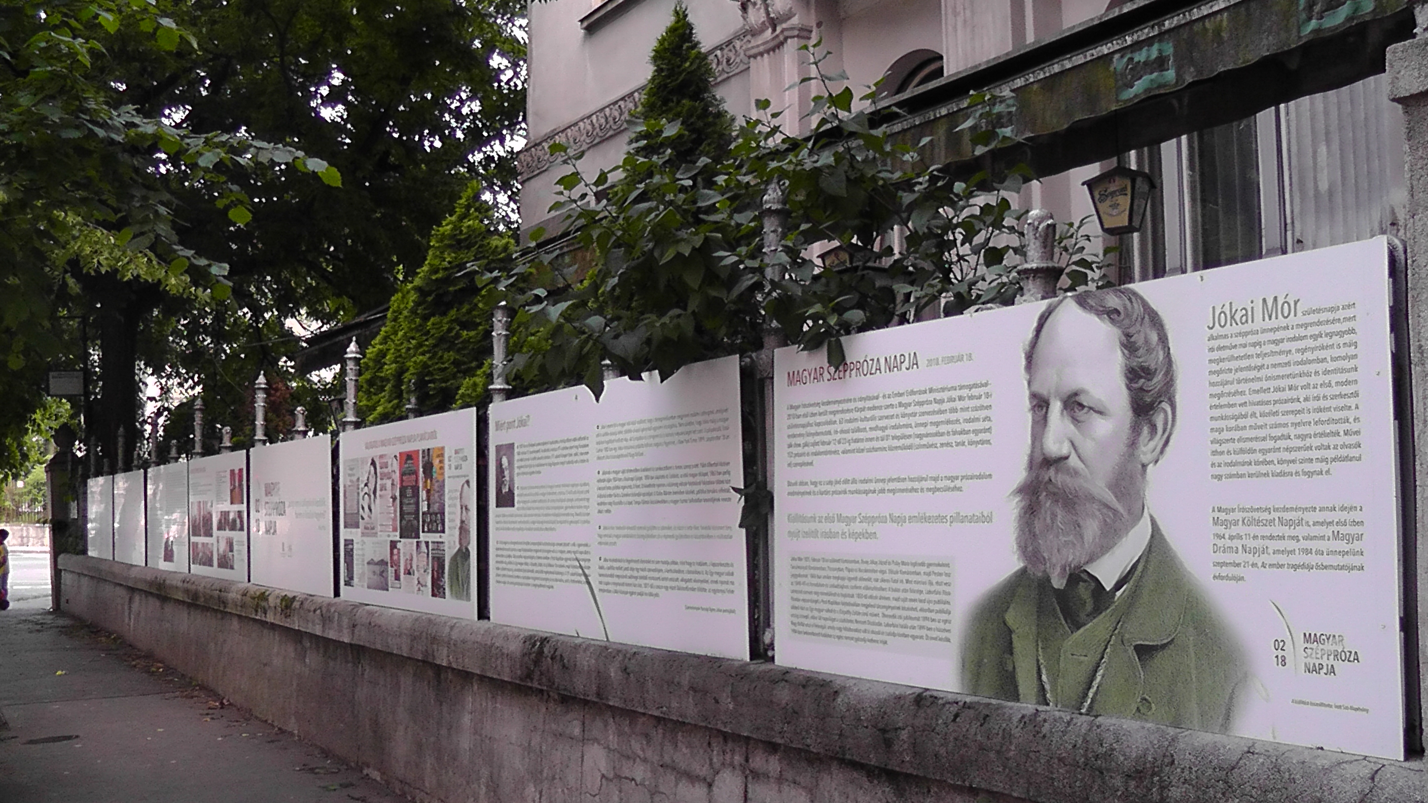 Постеры на заборе, за которым здание Magyar Írószövetség -ассоциации венгерских писателей.