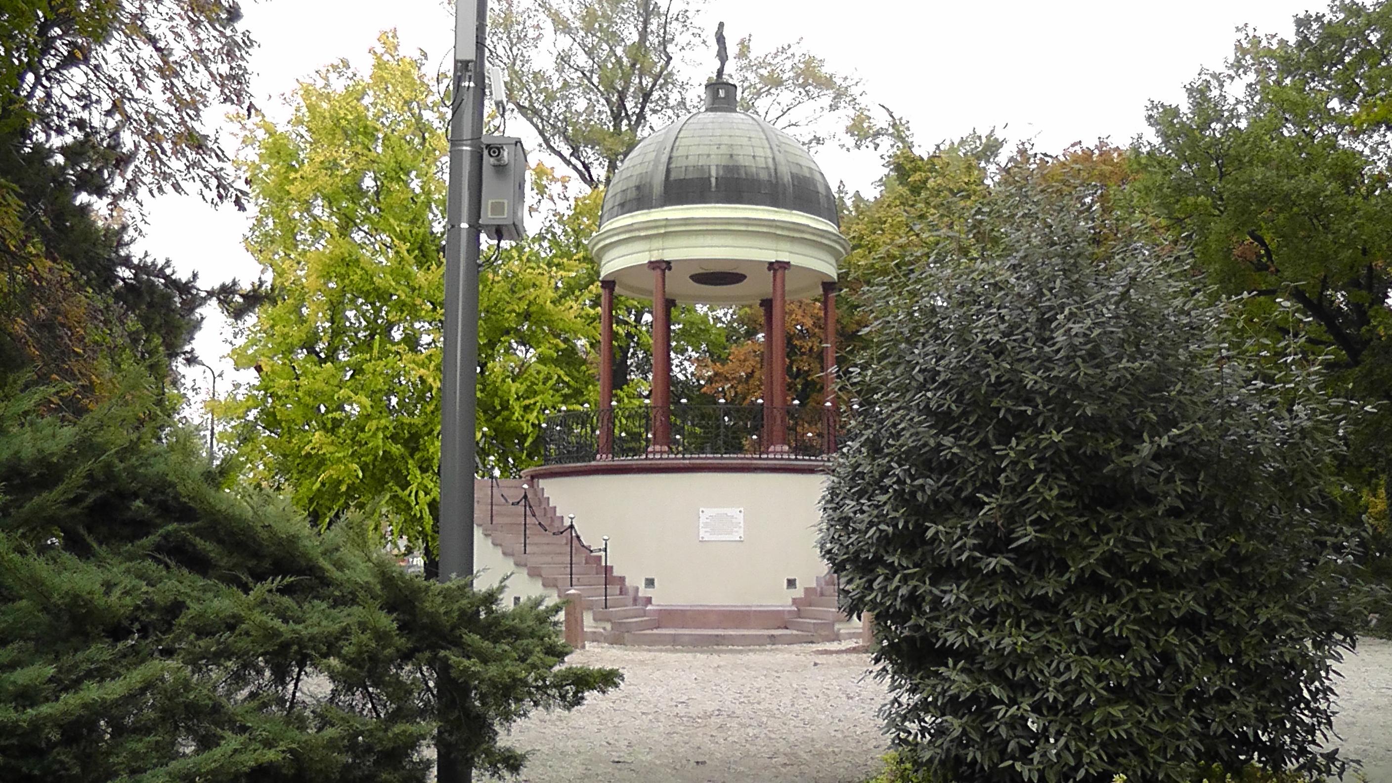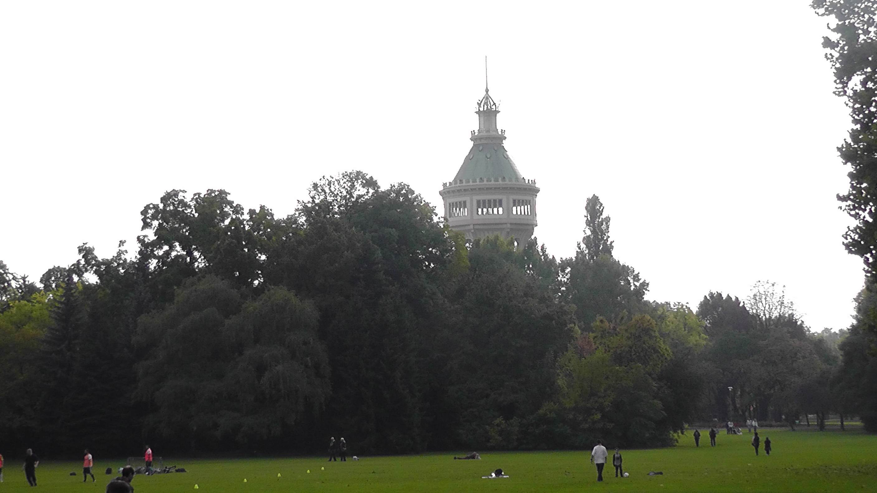 Над деревьями проглядывается восьмиугольная водная башня в стиле арт-нуво, по совместительству она служит обзорной площадкой. Наверное, с ее высоты- 57 метров, замечательный вид не только на остров и Дунай, но и на город. Восхождение не входило в наши планы, да уже и вечер наступил вечер, вряд ли на вход работала башня. Теперь приспособили помещения внутри под выставки современного искусства. Рядом расположен открытый театр, где летом показывают оперные спектакли. При башне также работает ресторан.