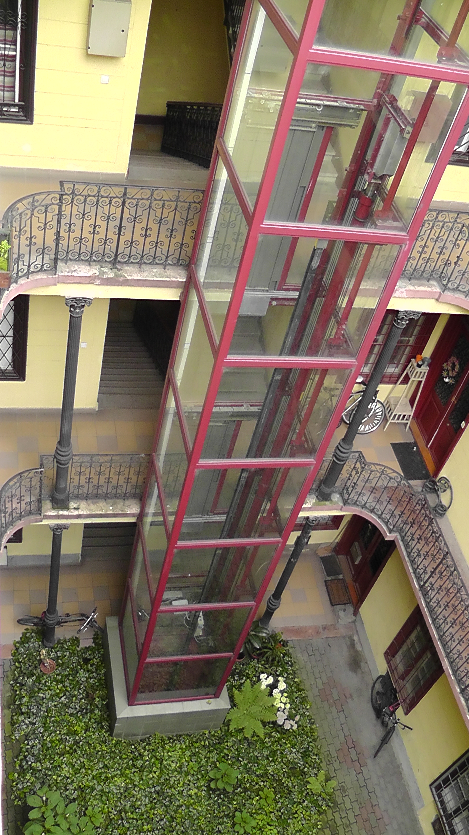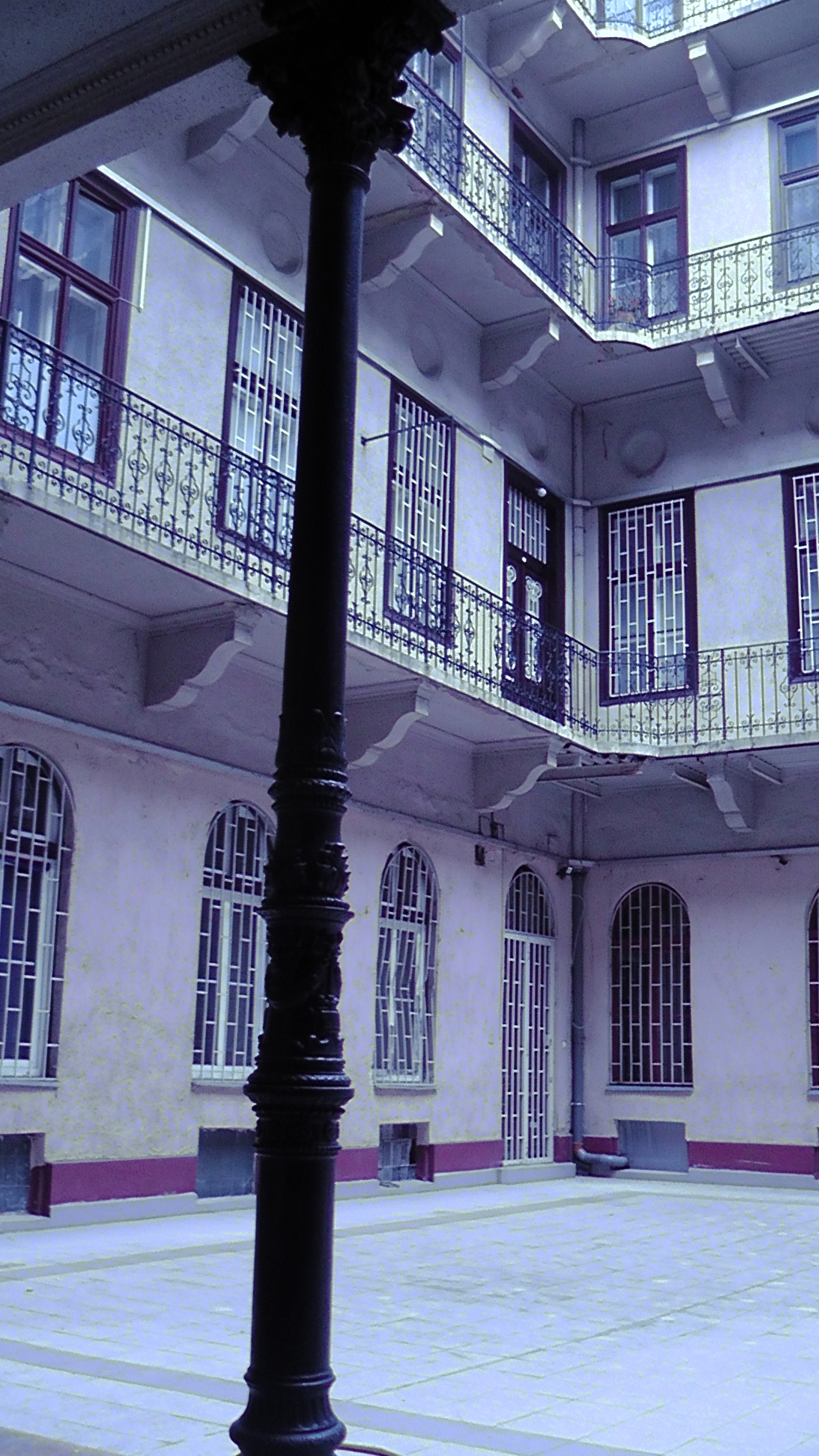 С улицы дом выглядит, как дом. Но войдя в подъезд, точнее, в проход за подъездной дверью, находим внутренний дворик-каре. Такая планировка позволяла выжать из занимаемого домом пространства максимальное количество жилой площади. На высоту всех этажей двор опоясан рядами галерей. Ограждения не просто ограда, а и украшение из ажурного чугуна, кованного железа.