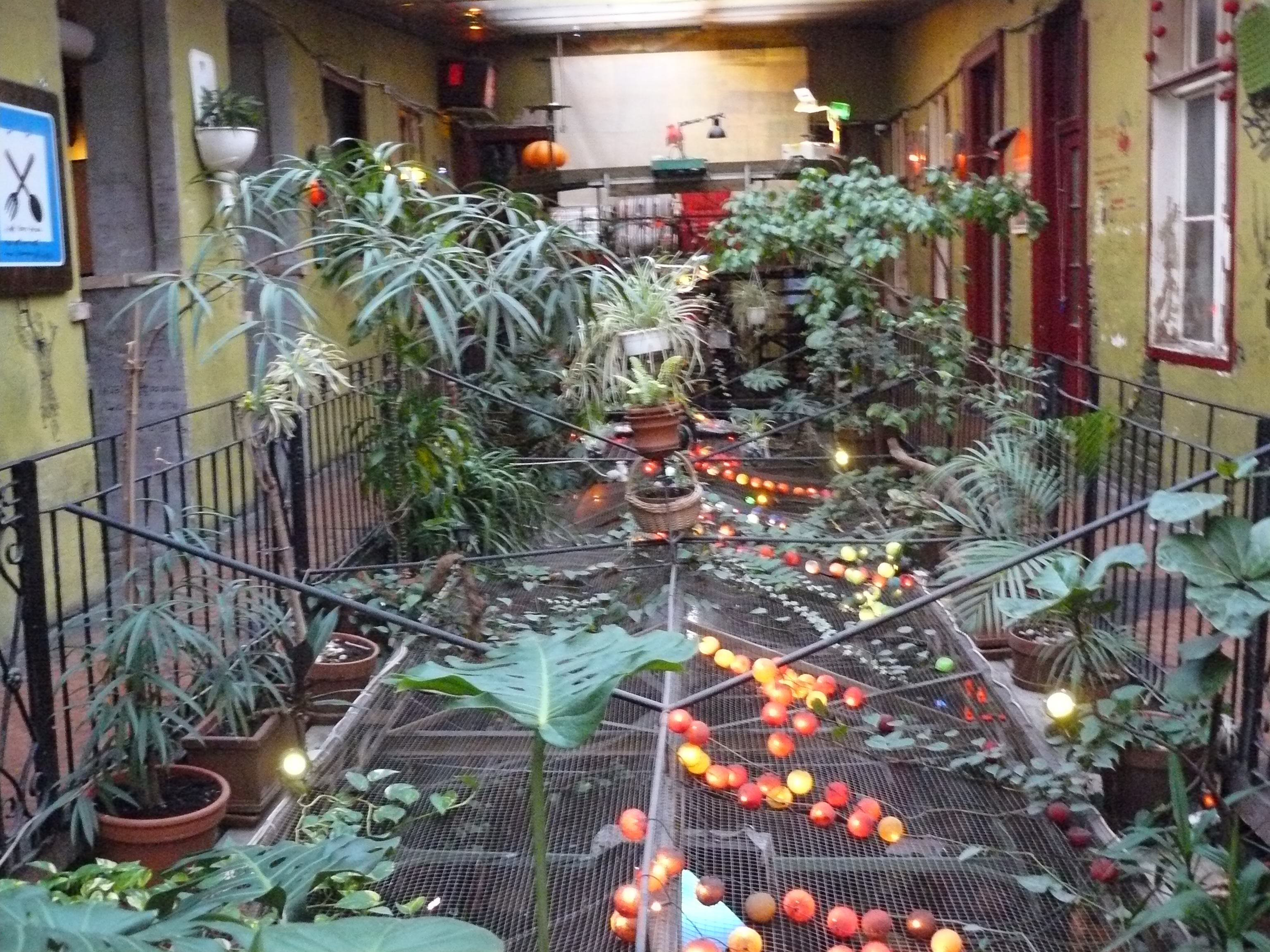 На двух этажах бара вертикальные, горизонтальные плоскости переходов, лестничных пролетов, комнат заполнены граффити, озеленением, свисающими элементами декора.