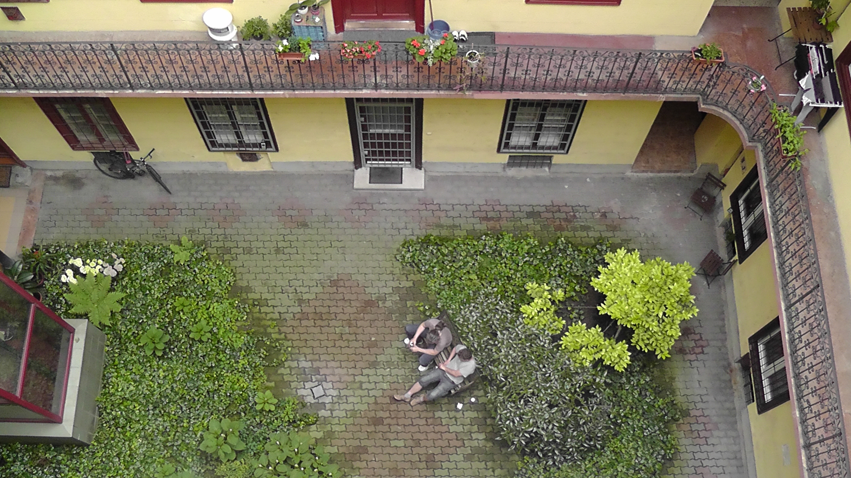Во внутренних дворика-колодцах никаких мусорных баков или стоянок для машин, вместо них зачастую устроен мини-садик. Трогательные деревца, тянущиеся к солнцу вопреки, каменным стенам, нависающих над ними. Нежная зелень небольших клумб.