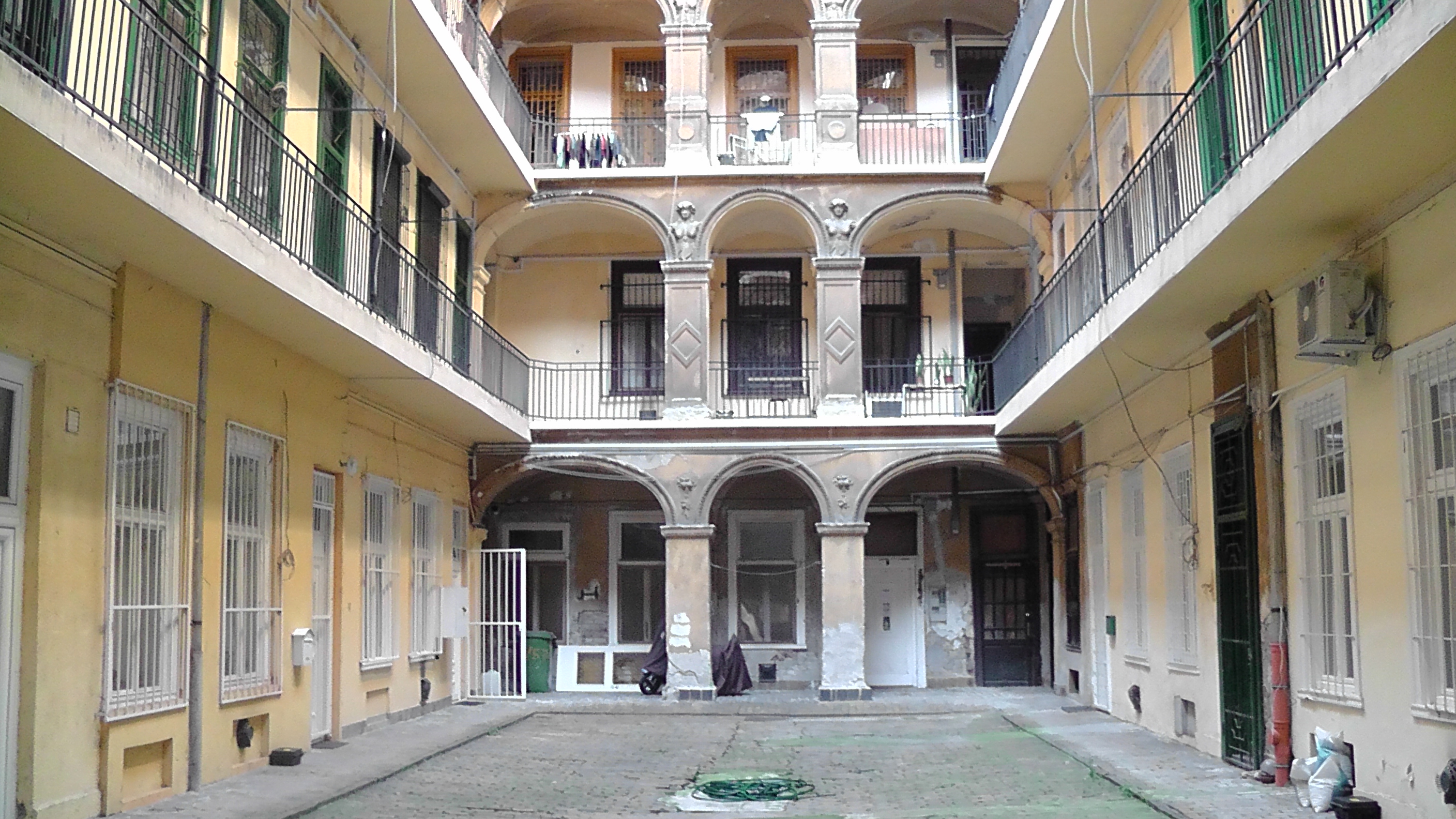 Архитектура европейских городов второй половины XIX века была ориентирована на нужды состоятельных господ. В то время семья занимала не отдельную квартирку с выходом на галерею, а целый этаж. Поэтому окна ванной комнаты могли выходить на галерею (мимо же никто посторонний не ходит). Были помещения для прислуги, «черные» лестницы и другие признаки буржуазного расслоения. После революции 1918 г. в Венгрии дворцы отошли народу, доходные дома так же. И стали дробиться жилые пространства, появились отдельные квартирки на этажах. Бывая в них, видно, как было перегорожено некогда огромное пространство зала и выкроено из него несколько комнат. Это выдает лепнина, которая скрывается в стене и возникает в соседней комнате. Переместились ванные комнаты и коморки для прислуги. В комнате, вдруг, оказывается круглое окно, глядящее на лестницу или галереи.