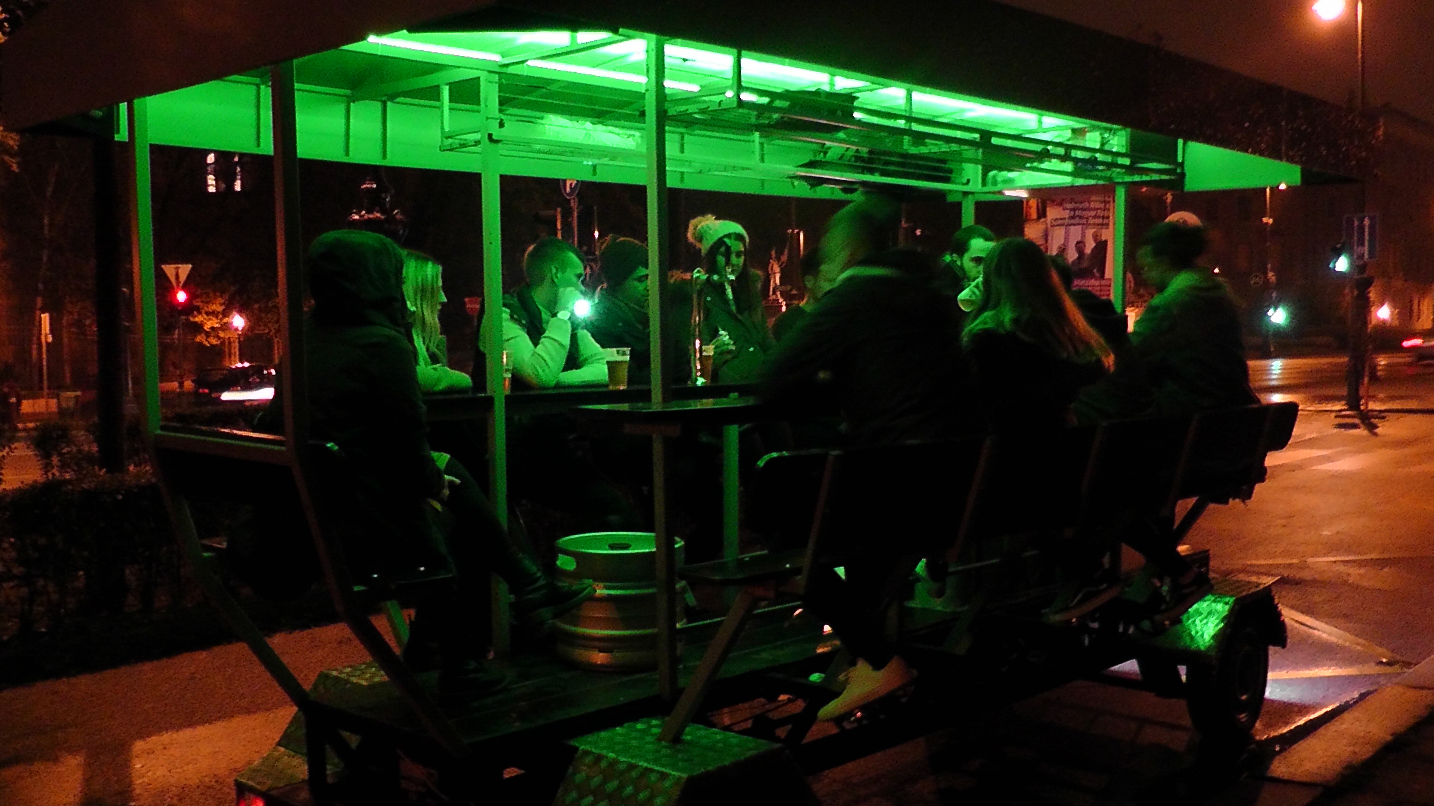 Современный город с проспектами, где едут миллионы машин, но - чу! это что такое? Пивной велосипед на целую компанию! Желающие на нем попить пивко, будут вынуждены сами крутить педали.