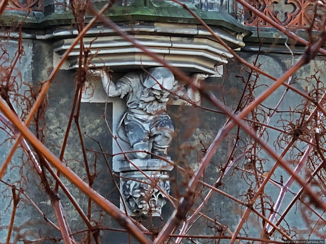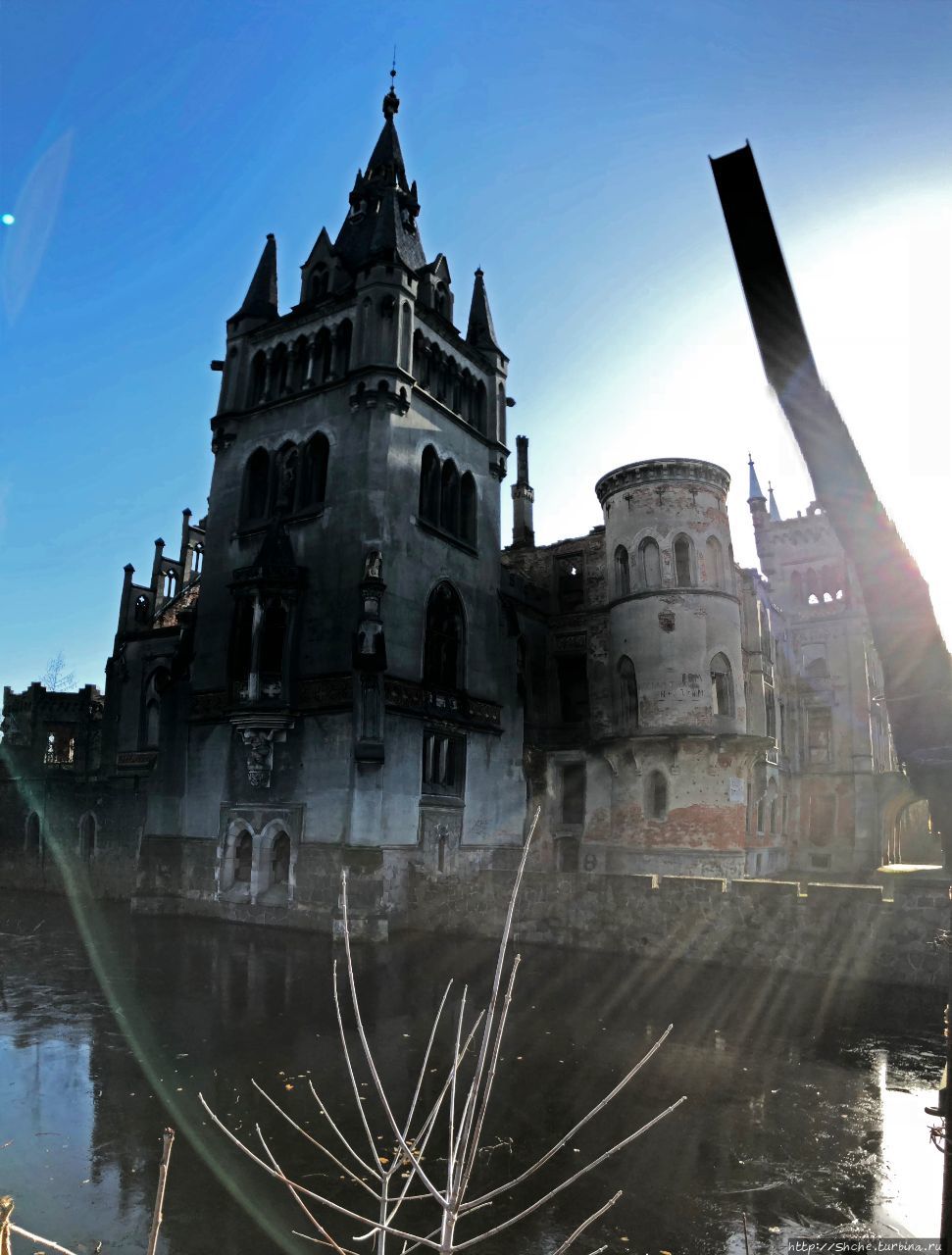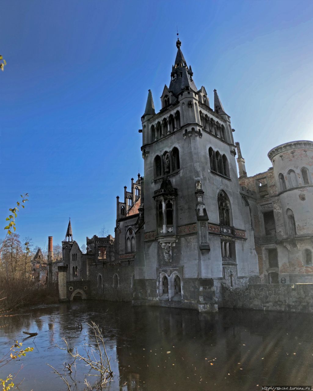 Вдоль водоема растет дикий кустарник, который затрудняет и прогулку вдоль берега, и обзор замка. Видимо мне повезло, что листва уже опала, и я смог хоть как-то рассмотреть это грандиозное даже в этом состоянии строение.