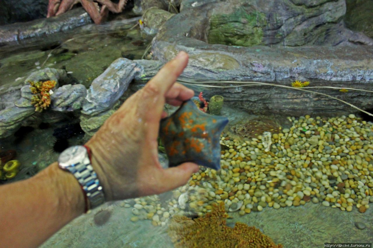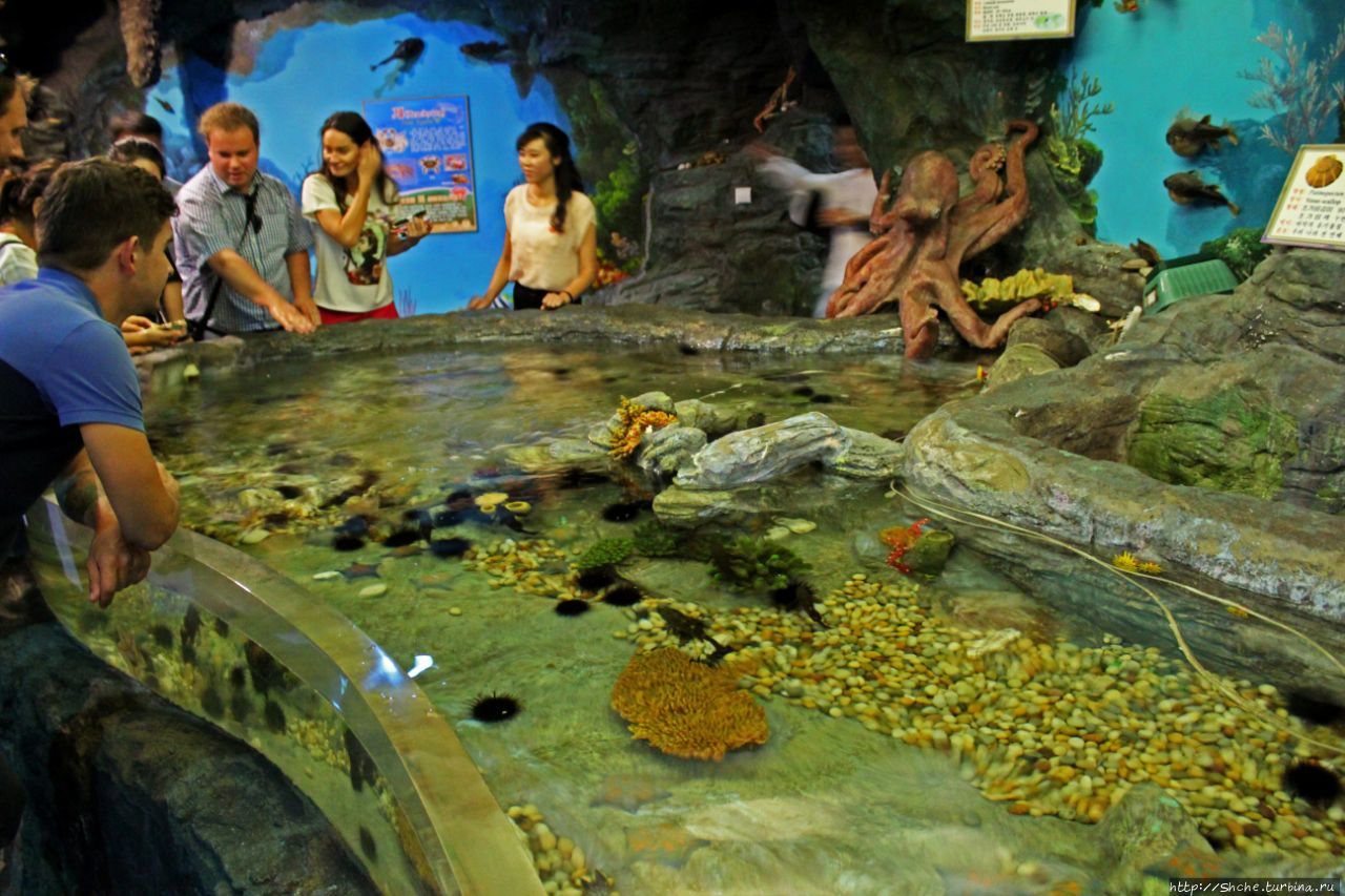 Но и это еще было не все. Из тоннеля мы вышли в комнату с контактным аквариумом, в котором можно было потрогать руками небольших скатов и морских ежей...