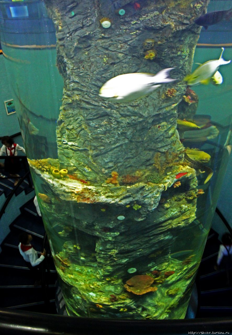 Здесь мы обнаружили, что в океанариуме не одни. как раз снизу поднималась группа ребятишек в пионерских галстуках. Дети, они и в КНДР дети — резвые и шумные) В полумраке помещения на фото их контуры оказались сильно "размазаны")