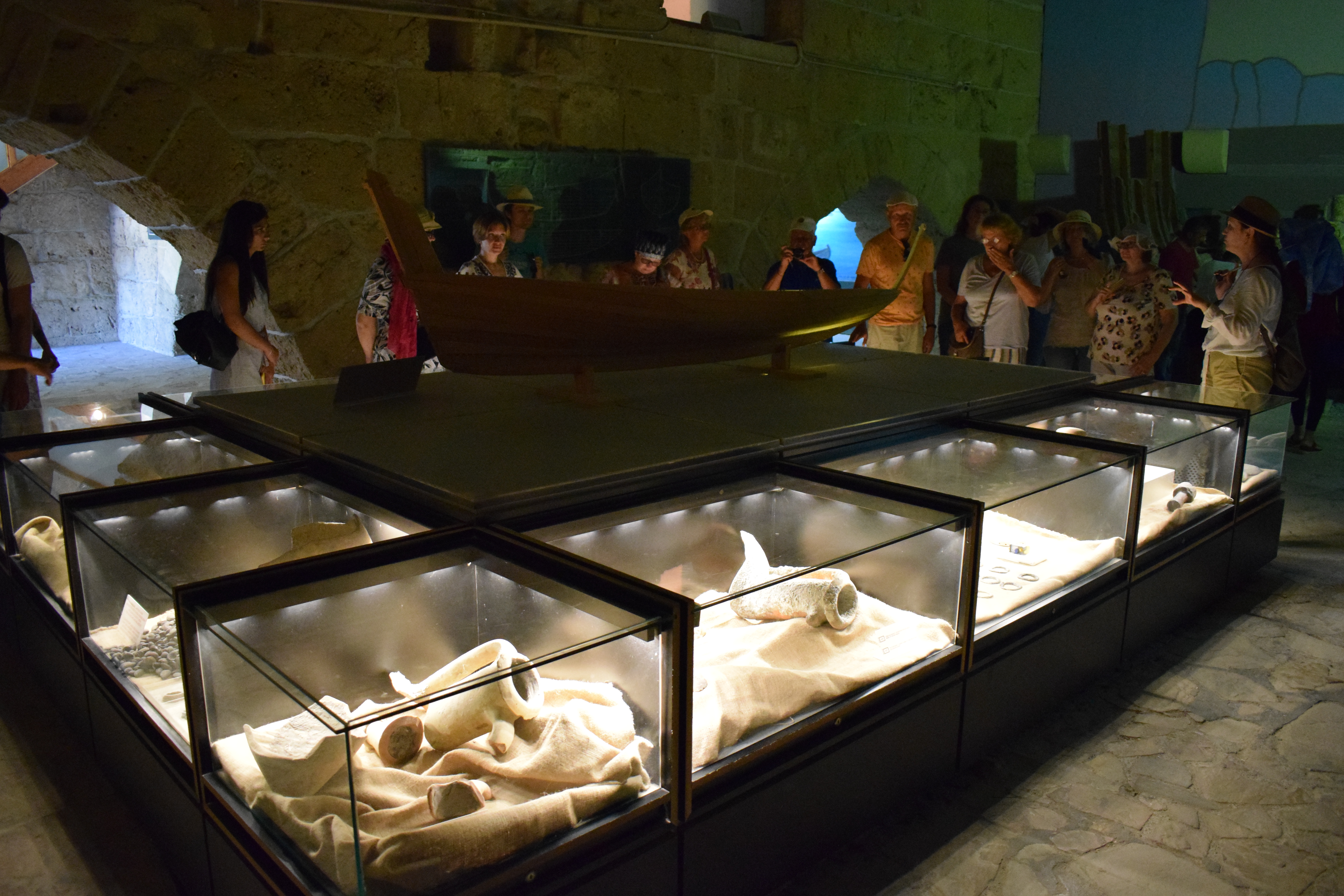 Но другие посещения ещё были. Маленький городок у моря называется по-гречески Кирения (или Кериния, или Кириния… пишут по-разному), по-турецки Гирне. Автобус остановился недалеко от берегового форта, находящегося в отличной сохранности. Можно походить по стенам, но наше время ограничено, и гид повела нас в местный музей единственного экспоната: найденного ещё в довоенное время древнегреческого торгового корабля. Сам корабль сейчас находится на реставрации, укутан полиэтиленовой плёнкой и с трудом просматривается. А вот грузы с него можно разглядеть под стеклом: амфоры, чашки, наконечники стрел…